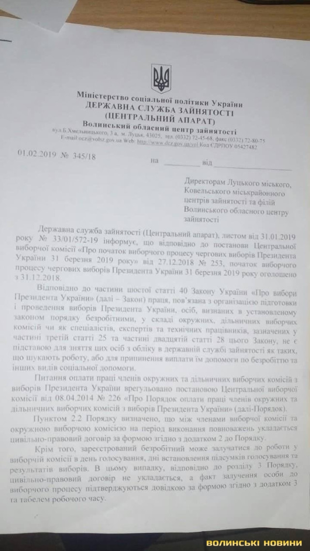 Тим не менше, громадяни, які приходили на прийом у Ратнівський районний центр зайнятості до своїх інспекторів, разом із вимогою про надання письмової розписки одночасно отримували для ознайомлення лист Волинського обласного центру зайнятості від 01.02.2019 року №345/18 за підписом директора Романюка Романа В'ячеславовича.