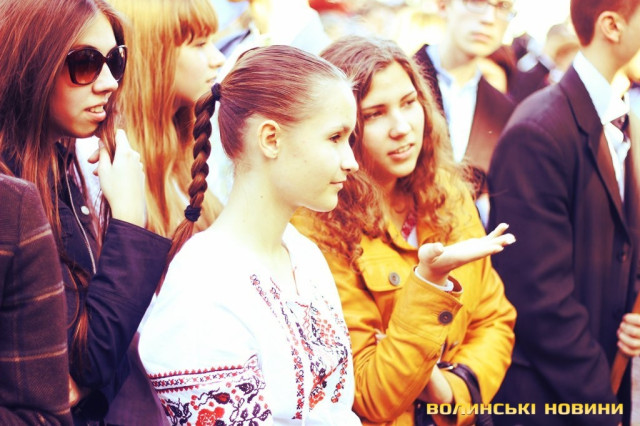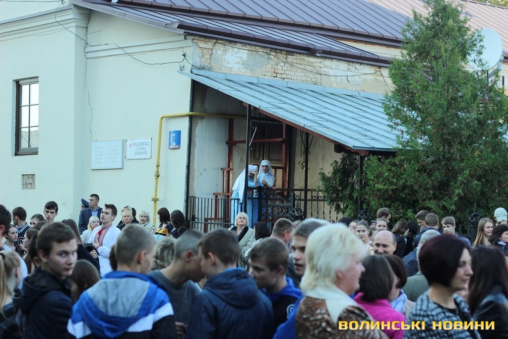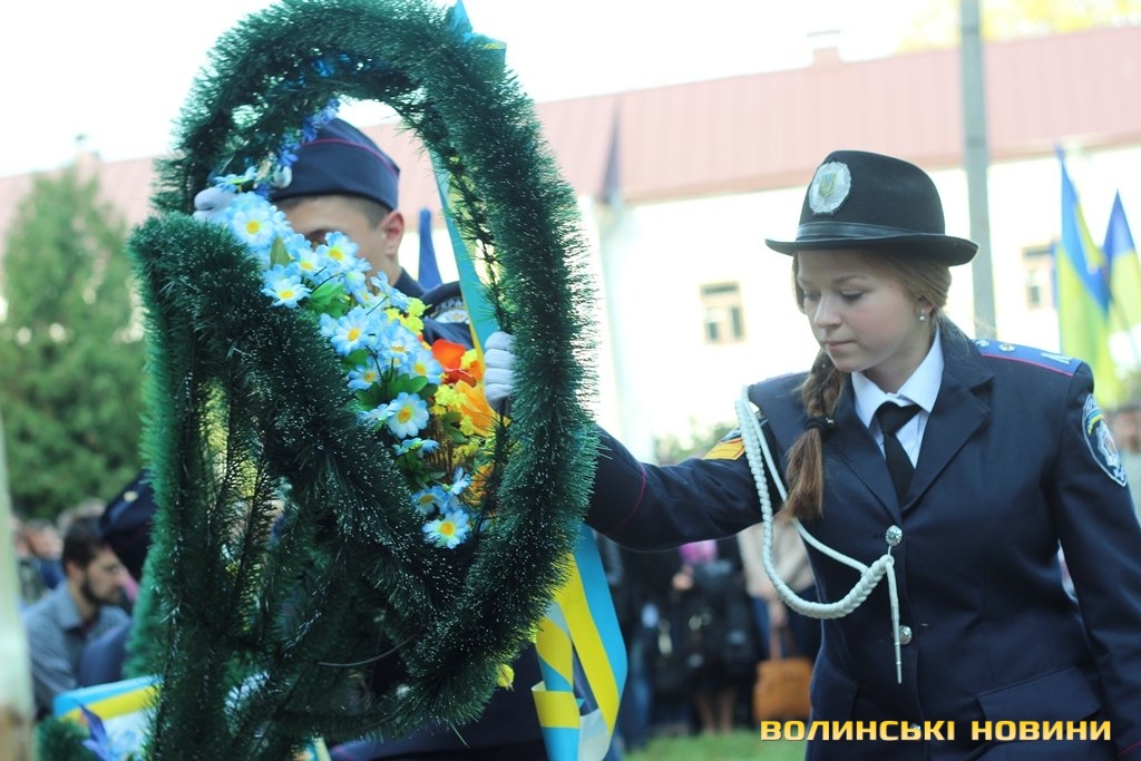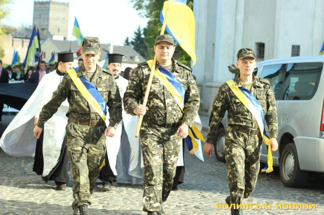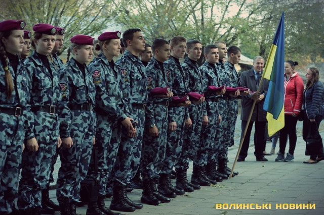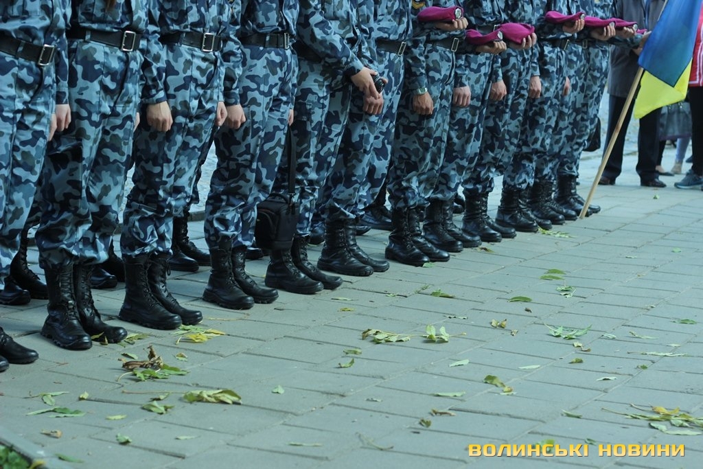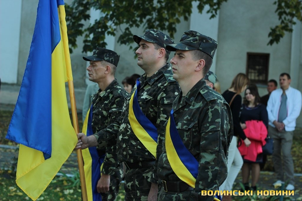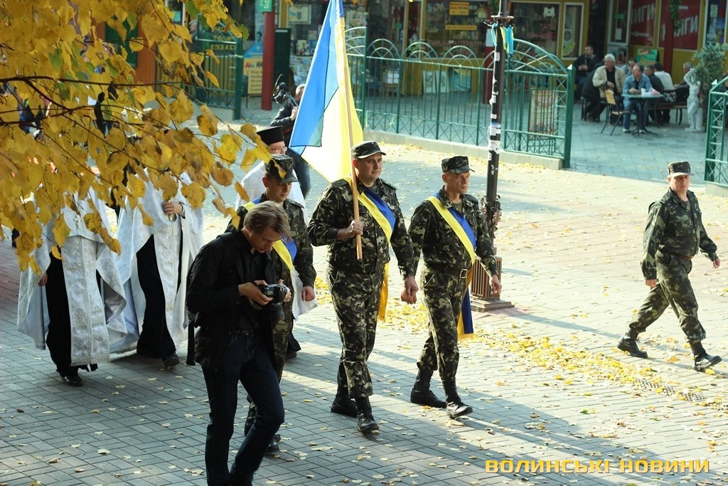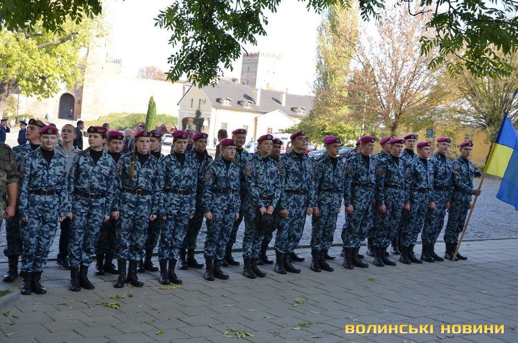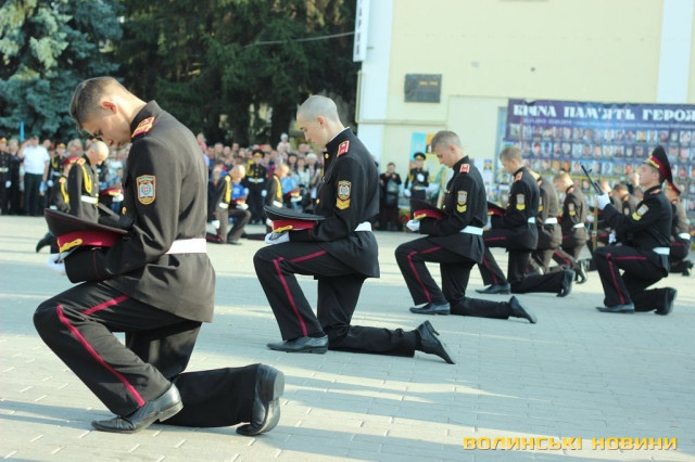 Після тужливої пісні-реквієма «Вічная пам’ять» колона вирушила до Театрального майдану міста, де відбулась посвята в ліцеїсти учнів Волинського обласного ліцею з посиленою військово-фізичною підготовкою.