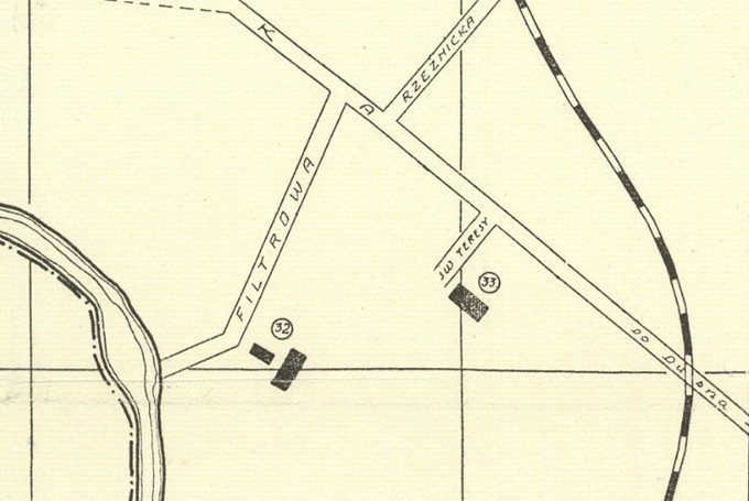 Вулиця Фільтрова і технічні будівлі (позначені 32) на карті Луцька тридцятих років, фрагмент. Копія з Національної бібліотеки Polona
