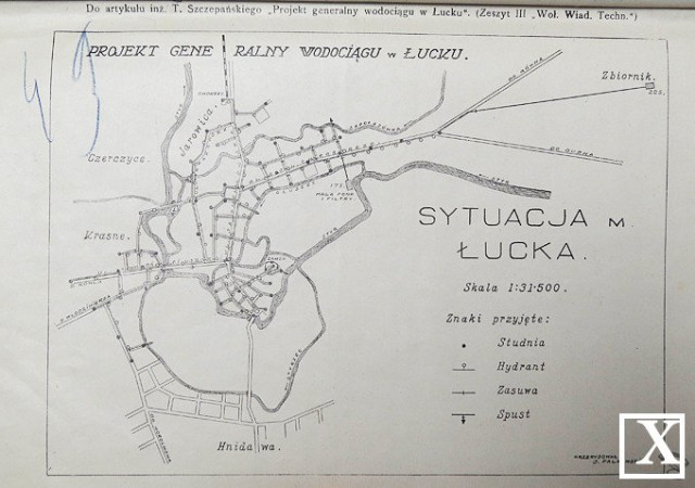В цій нудній і часом заплутаній історії з’являється вельми цікавий момент – п’ятий проект водогону для Луцька (попередні чотири були ще за царської Росії). Окружна дирекція робіт публічних (відділ Волинського воєводства) виразила готовність допомогти провести передпроектні роботи щодо влаштування луцького водогону. На запрошення дирекції у квітні 1925 року в Луцьк прибув випускник Цюріхської політехніки Тадеуш Щепанський. Він саме проектував водну мережу для Радома (а через два роки став першим директором радомського Міського підприємства водогону і каналізації) і на прохання дирекції публічних робіт створив проект і для Луцька. Крім опису, проект містив карту з позначенням розташування ключових пунктів водогону. Сьогодні роздивлятися такі мапи неймовірно цікаво!
