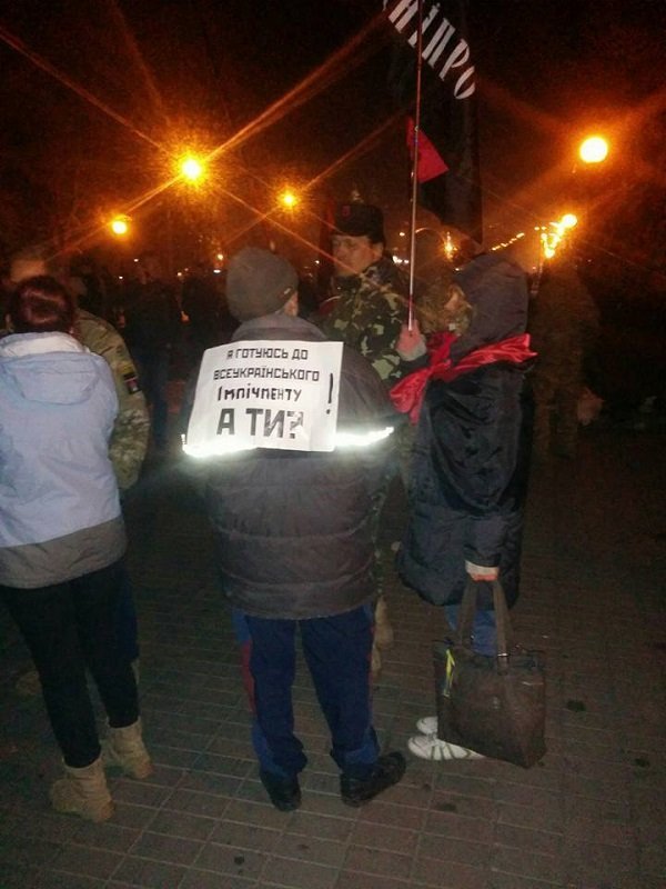 Мітингувальники тримали плакати «Ні реваншу», «Свободу політв'язням» і «Дніпро, вставай!». На акцію прийшли бійці АТО, волонтери, прості городяни.