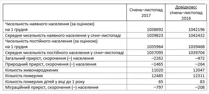 Упродовж січня–листопада чисельність населення зменшилася на 2262 особи.
