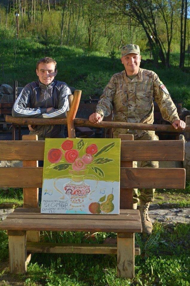 "Є 3 роботи хлопців, які особисто стали мені дорогими. Справжні Герої, справжні чоловіки... За такими - майбутнє нашої Украіни. Це - Віталій Михалевич(провів в полоні 7 місяців), Олег Худинець (важко поранений військовий) Руслан Кашаюк, поранений поет-айдарівець). До реабілітації хлопці не тримали в руках пензля. Гляньте, які перетворення змогла зробити з ними арт-терапевт Тетяна Мялковська! Які роботи... і зігріті душі", - додає волонтер.