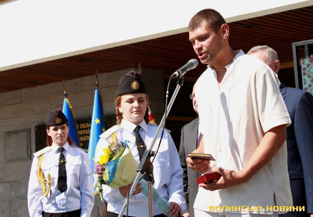 Привітавши гостей міста іноземними мовами, міський голова Микола Романюк зазначив, що Луцьк – надзвичайно красиве, справді європейське місто, зі своєю неповторністю і особливою аурою, наповнений міфами та історіями, колиска багатьох талановитих людей. Здобутки міста були б неможливими без щедрих і талановитих лучан, які самовідданою працею і теплом сердець примножують його славу.Для того, щоб гідно оцінити подвиги та досягнення тих, хто прославляє рідне місто, розпочали із вручення державних нагород. Так, орденом «За мужність» 3-го ступеня посмертно нагородили сержанта стрільця-санітара другої роти охорони 24-го батальйону «Айдар» Романа Луцюка. Орден отримала дружина полеглого. Медаллю «Захиснику Вітчизни» нагородили старшого солдата Павла Ковальського, який служив у складі 51-ї та 128-ї ОМБ, пройшов Іловайський та Дебальцевський котли, молодшого сержанта Богдана Ляшука, який служив заступником командира бойової машини, навідником-оператором 2-го механізованого батальйону 51-ї ОМБ, солдата Анатолія Свередюка, механіка-водія БМП-1 окремої танкової бригади військової частини В-1688, який проявив мужність і героїзм в боях у районі міста Мар’їнка Донецької області, солдата Володимира Хоміча, командира машини зенітно-ракетного артилерійського дивізіону 51-ї ОМБ.