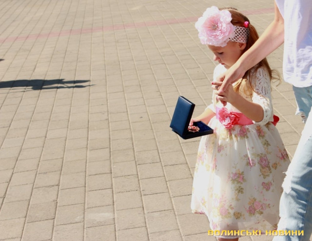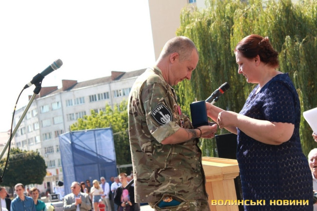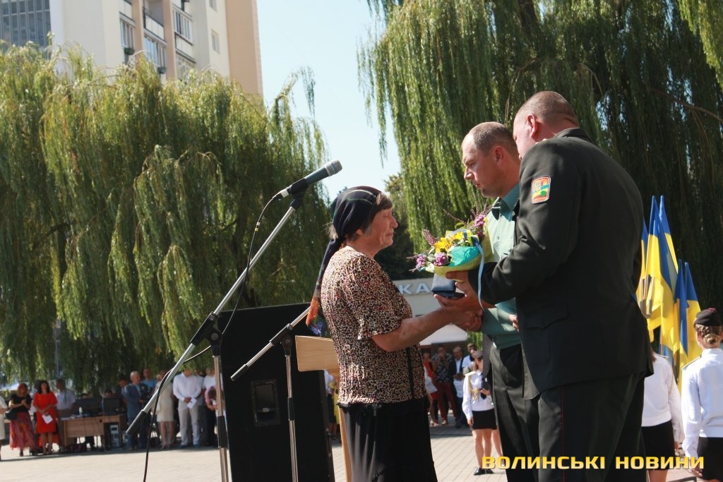 За жертовну любов до Вітчизни, відданість, доблесть та звитягу медаль 51-ї ОМБ «За мужність та відвагу» вручили посмертно полеглим воякам. Нагороди отримували їхні матері, діти та дружини.Голова ГО «Члени родин загиблих в АТО «Надія» Любов Карабан зауважила, що останні два роки були нелегкими для усієї України та Луцька зокрема, а на цьому майдані радісно приймали демобілізованих, тих, хто повернувся з полону, але лучани збиралися і у ті дні, коли проводжали в останню дорогу полеглих Героїв. Вона подякувала лучанам, які молилися за вояків на сході та членів їхніх родин вдома.