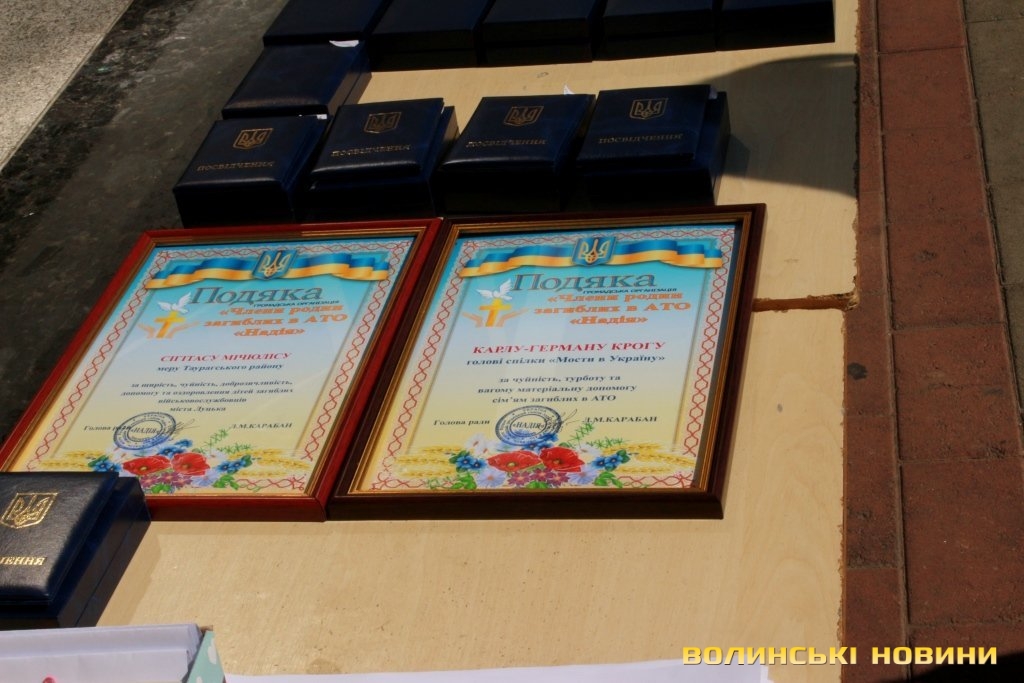 Подяки отримали іноземні меценати, які допомагають учасникам АТО та членам родин загиблих. Так, подяку ГО «Члени родин загиблих в АТО «Надія» отримав мер Таурагського району Сігітас Мічюліс (Литва), який проявив чуйність і щирість, надавши можливість дітям загиблих в АТО оздоровитися у Литві. Аналогічну подяку вручили очільнику спілки «Мости в Україну» Карлу-Герману Крогу, який пожертвував три тисячі євро (2800 євро витратили на операцію Сергію Федотову, 200 – матері зниклого безвісти бійців Катерині Хом’як). Карла-Германа Крога Указом Президента України нагородили орденом «За заслуги» 3-го ступеня. Він побажав Україні мирного шляху в європейське співтовариство та ЄС, пообіцявши надалі допомагати у цьому.За вірність військовій присязі, мужність, героїзм, патріотизм та безмежну любов до Вітчизни медаль «За вірність українському народу» ГО «Члени родин загиблих в АТО «Надія» вручили загиблим бійцям та живим Героям.