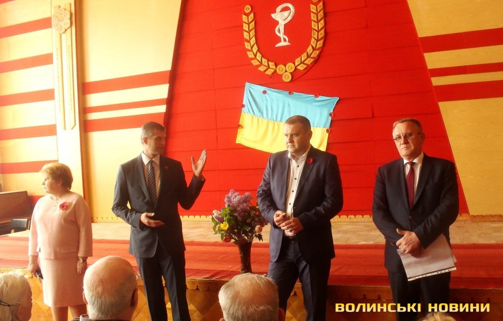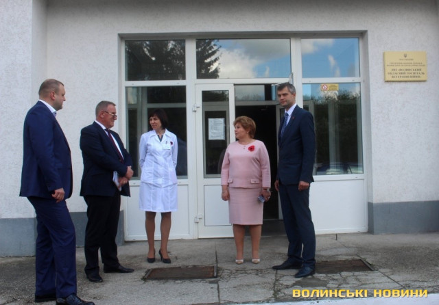 Під час передачі медикаментів з пацієнтами медичного закладу спілкувалися голова фракції «УКРОП» у Волинській облраді Вячеслав Рубльов та керуючий справами виконавчого апарату облради Дмитро Дубняк.
