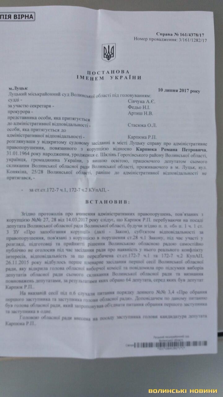 Як йдеться у матеріалах суду, Романа Карпюка звинувачували у тому, що він, будучи депутатом Волинської обласної ради та беручи участь у голосуванні під час засідання ради, не повідомив про конфлікт інтересів.