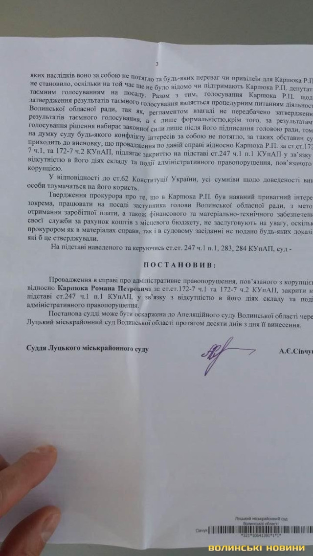 Відтак, Луцький міськрайонний суд постановив закрити провадження відносно Романа Карпюка через відсутність у його діях складу адміністративного правопорушення.