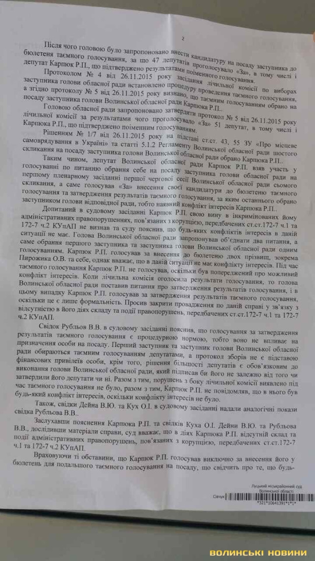 Разом з тим, у документі зазначено, що твердження прокурора про те, що Роман Карпюк був зацікавлений працювати на посаді заступника голови з метою отримання заробітної платні, а також фінансового та матеріально-технічного забезпечення своєї служби за рахунок коштів місцевого бюджету, не заслуговують на увагу, оскільки не було подано будь-яких доказів на підтвердження цього.