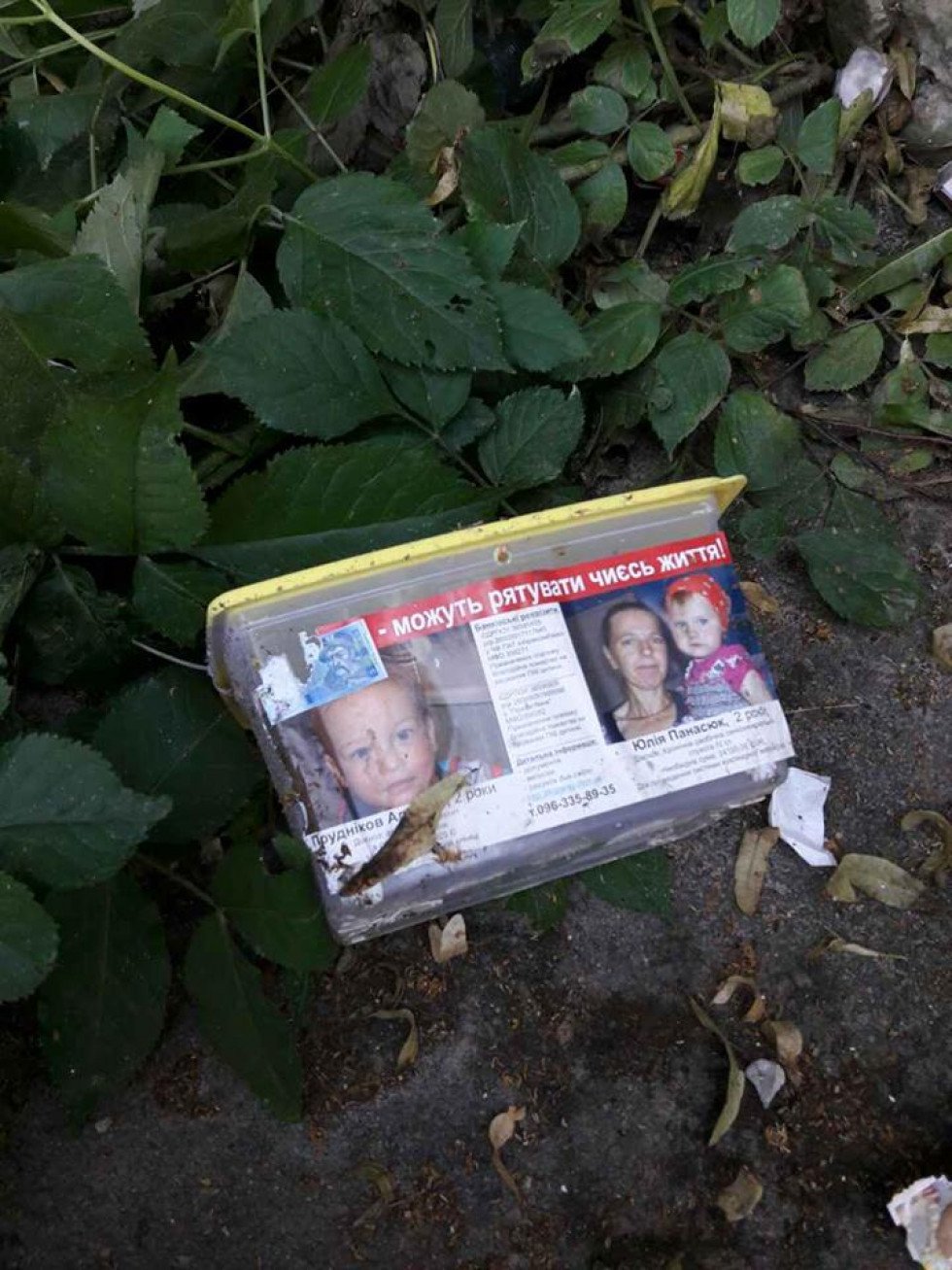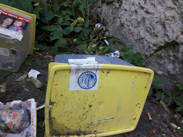 Благодійні скриньки обклеєні фотографіями задля збору коштів валялись на землі.