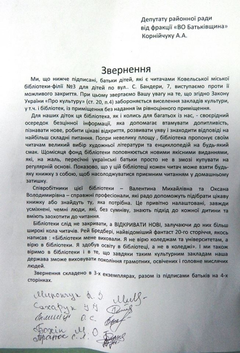 Батьки дітей, які відвідують бібліотеку-філіал № 3 в Ковелі на вулиці Степана Бандери, просять владців не закривати заклад. Відповідне колективне звернення вони надали депутату Ковельської райради Анатолію Корнійчуку.