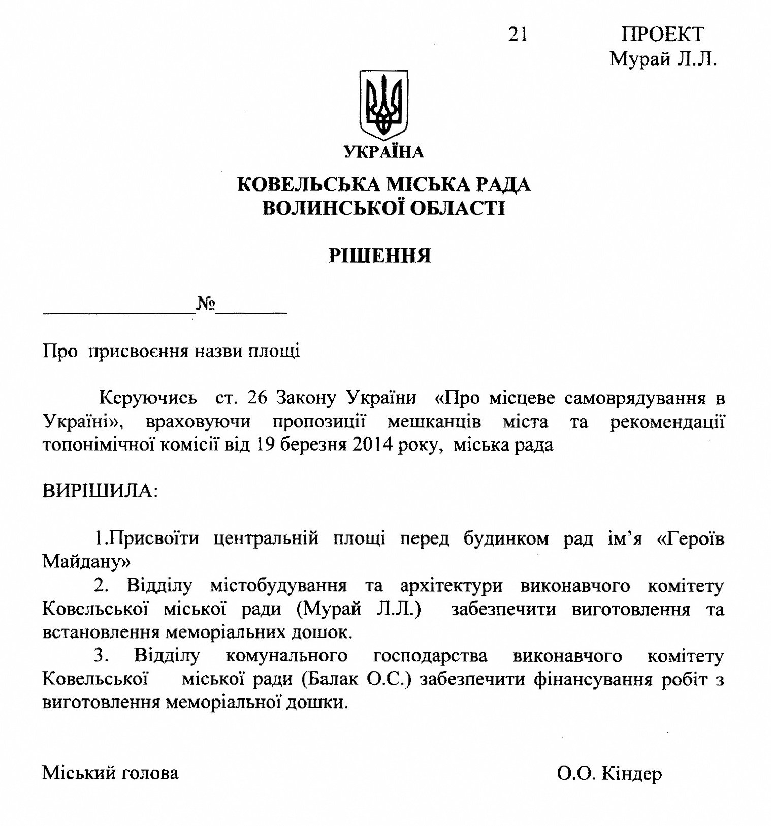 На сьогоднішній сесії Ковельської міської ради депутати одноголосно прийняли рішення «присвоїти центральній площі перед Будинком рад ім’я «Героїв Майдану», керуючись статтею 26 Закону України «Про місцеве самоврядування в Україні», враховуючи пропозиції мешканців міста та рекомендації топонімічної комісії від 19 березня цього року. Згідно рішення, відділ містобудування та архітектури виконавчого комітету міськради має забезпечити виготовлення та встановлення меморіальних дошок, а відділ комунального господарства – фінансування цих робіт.