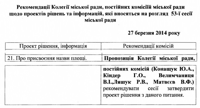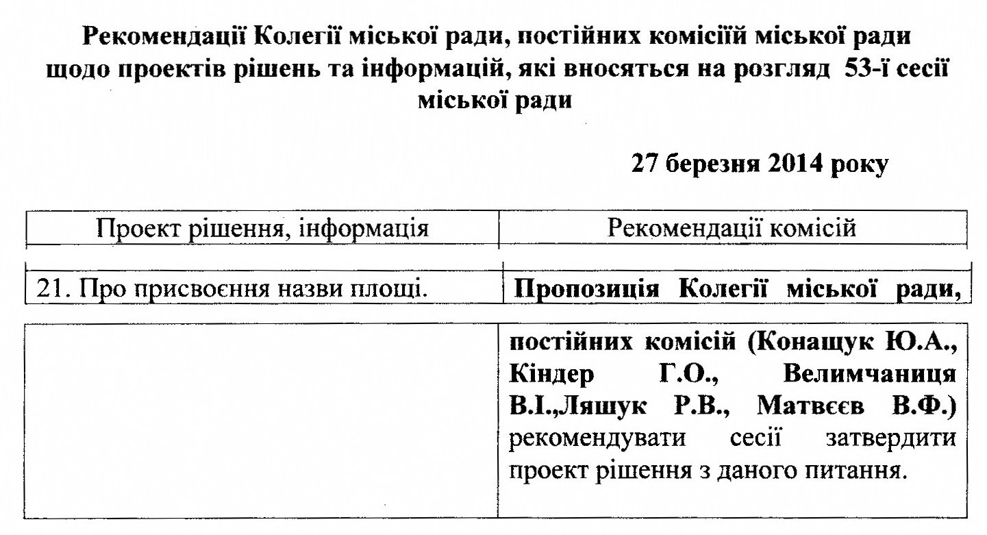 Закон чітко зазначає, що питання про присвоєння об’єктам права власності імен назв історичних подій мало би порушуватися персонально міським головою, в даному випадку – Олегом Кіндером, шляхом підготовки останнім відповідного подання про присвоєння такої назви. Самі ж пропозиції щодо присвоєння центральній площі міста назви могли вноситися на його розгляд державними органами, трудовими колективами, об’єднаннями громадян та окремими громадянами.