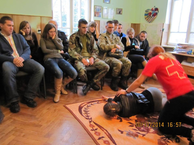 Нагадаємо, тренером занять була Тетяна Ковалюк, співробітник товариства Червоного хреста, яка проходила навчання по шведській програмі тактичної медицини та цивільної оборони. Серед запрошених гостей: лікар, який отримав поранення під час визволення Слов'янська Сергій Зінчук та Герої, які повернулися з АТО.