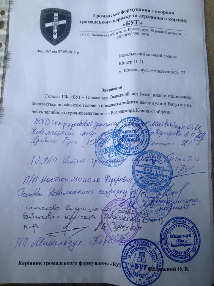 Ковельські громадські активісти просять мера міста Олега Кіндера перейменувати вулицю Ватутіна, радянського воєначальника, генерала армії на Володимира Кияна«Тайфуна» – загиблого на сході Героя. Відповідне звернення опублікував на своїй сторінці у Фейсбуці користувач Олександр Харковський.