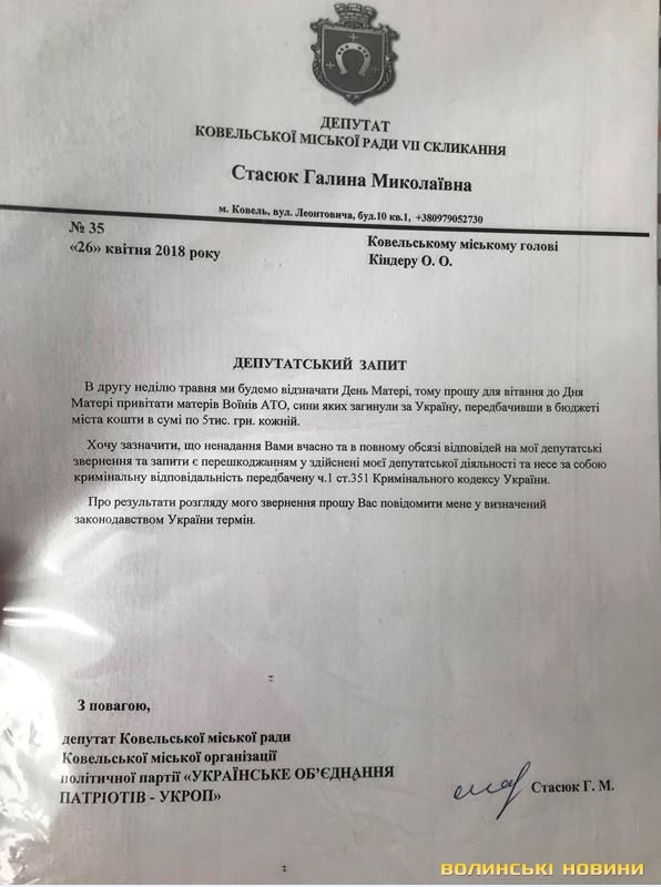 Відповідний депутатський запит озвучила представниця фракції УКРОП у міській раді Галина Стасюк. У ньому було вказано, що у другу неділю травня буде відзначатися День матері, а тому почесним обов`язком Ковельської міської ради є вітання до матерів, сини яких загинули у війні на сході України. Для цього слід передбачити в бюджеті міста по 5 тис. грн. для кожної матері. Подібні ініціативи, як наголосила Галина Стасюк, є у багатьох містах України, зокрема і у Луцьку.