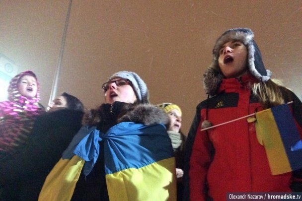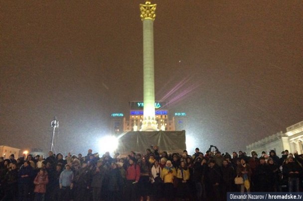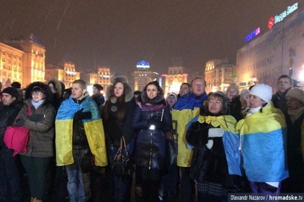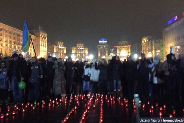 Активісти почали збиратися на Майдані задовго до 23:00. Багато з них — з національною символікою. Вони співали гімн, дивилися хроніки Майдану, запалили лампадки у пам'ять про загиблих на Майдані", - повідомляє "ТСН".