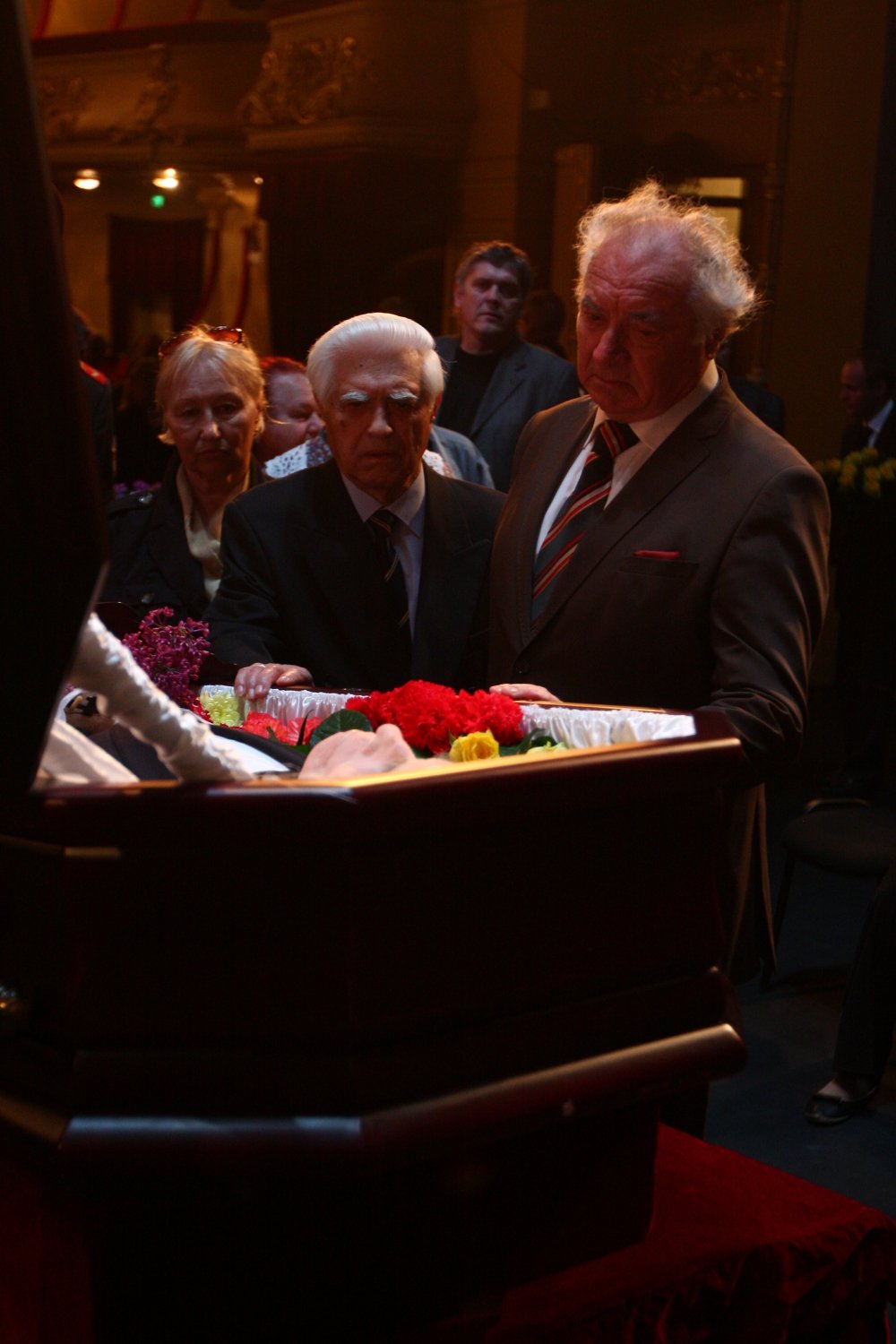 Близько 10:00 до театру під'їхав білий мікроавтобус. З автівки вийшла вдова Гнатюка 88-річна Галина Макарівна. Вона — філолог. З чоловіком у шлюбі прожила 66 років. Її супроводжував син 65-річний Андрій Гнатюк. Він очолює кафедру іноземних мов Київського університету.