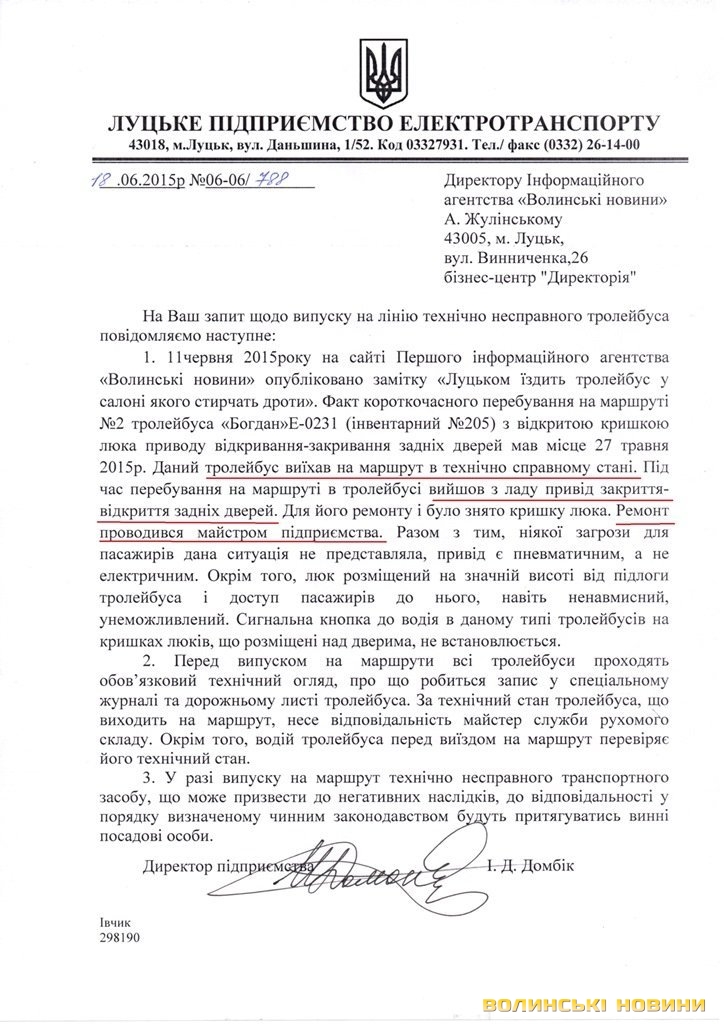 «Цей тролейбус виїхав на маршрут в технічно справному стані. Під час перебування на маршруті в тролейбусі вийшов з ладу привід закривання-відкривання задніх дверей. Кришку люка зняли, аби поремонтувати. Ремонт проводився майстром підприємства», - йдеться у відповіді Луцького підприємства електротранспорту за підписом директора Ігоря Домбіка.Втім, коли електромашина рухалася проспектом Волі, жодних ремонтних робіт у салоні не здійснювалося.