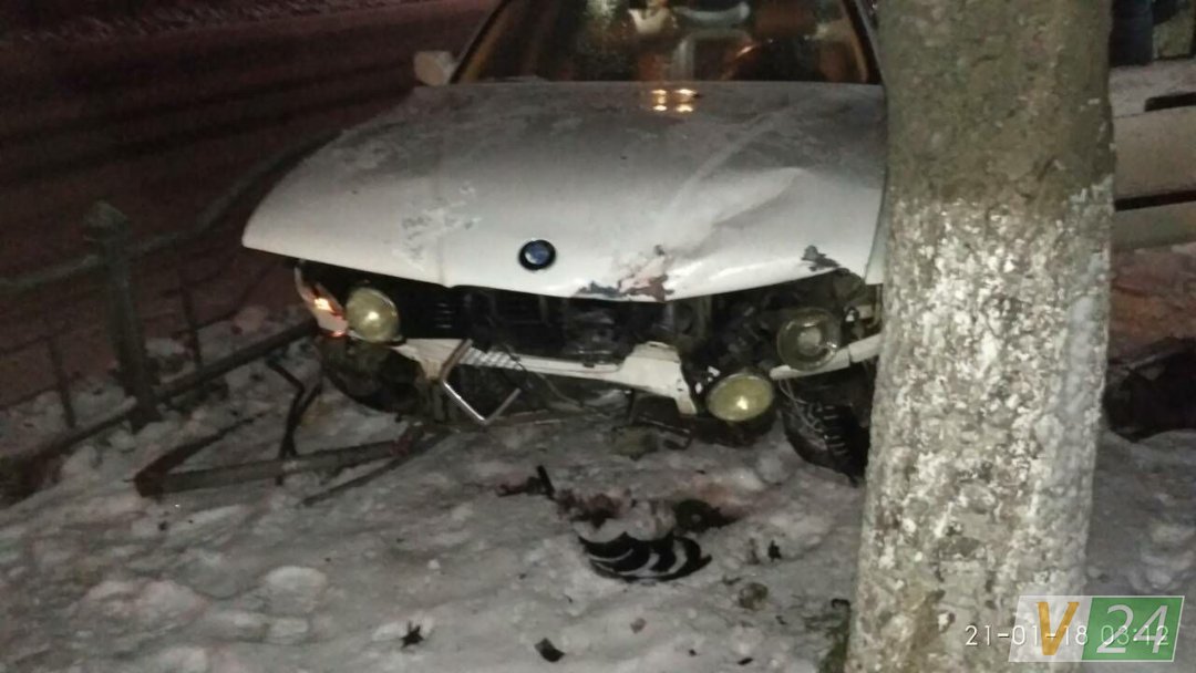 Автомобіль БМВ їхав проспектом Перемоги в напрямку мосту. Водій зупинилась на світлофорі, однак, як тільки рушила, авто занесло на слизькій дорозі. Спершу машина виїхала на зустрічну смугу, а тоді – влетіла у паркан. Зупинилась іномарка за кілька сантиметрів від дерева.