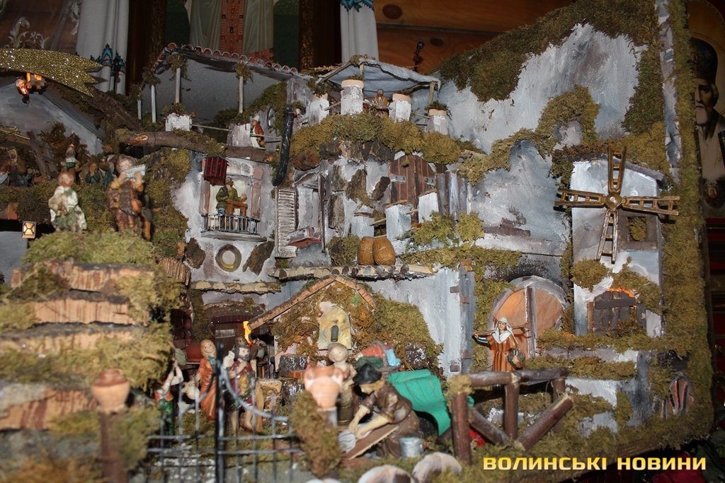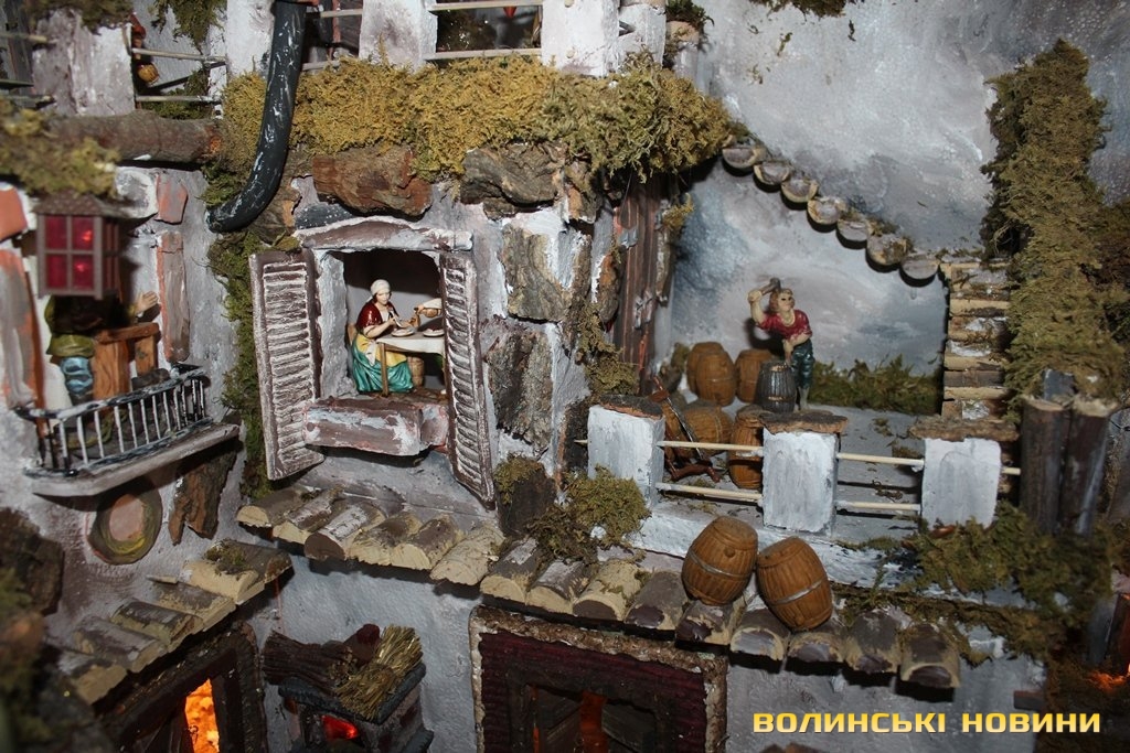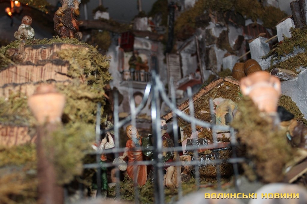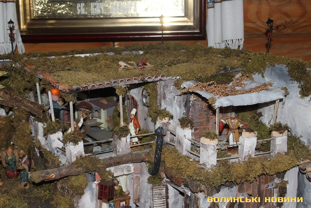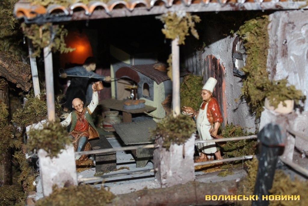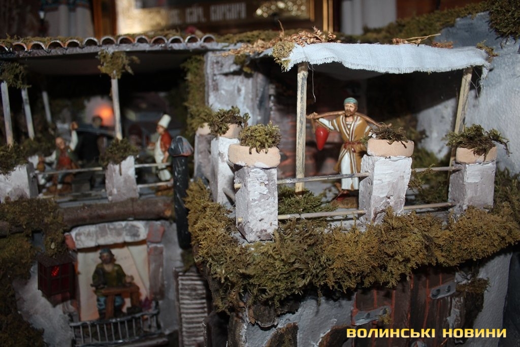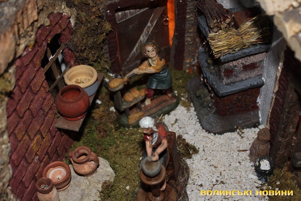 Незвичний вертеп з’явився в однову з храмів Луцька. Його унікальність привертає увагу сотні глядачів, адже таке відчуття, що у ньому вирує життя. Особливо полюбляють збиратися біля вертепу дітлахи. Такий подарунок храму Холмської Богородиці зробила лучанка, яка виїхала в Італію.Вертеп складається з півсотні мініатюрних фігурок: від вельмож до простих селян. Кожна з них не лише статуетка людини, а й певна життєва історія, в якій кожен у русі, будучи зайнятим буденними справами. Одні відпочивають, хтось працює, інші поросят на ринок везуть.А в цей час яскраво світить зірка над новонародженим Ісусом, біля якого стоять ангели і прийшли волхви з дарунками. Навколо триповерхові будиночки у яких багато деталей у мініатюрі. Наприклад, де майстер робить бочки, видно інструмент, з яким він працює.Заглянувши у бокове віконце на другому поверсі, видно, що сім’я зібралась за столом вечеряти і дружина якраз взяла на вилку шматок м’яса й відкрила вуста.Усе це створює відчуття живого дійства. Окрім цього, багато елементів вертепу рухомі і світяться: крутиться вітряк на млині, в колодязі відерце опускається і піднімається, італієць прасує одяг, а пекар закладає у піч паляниці.Ці масштабні мініатюри вражають, адже стільки подій гармонійно розміщені у вертепі, довжина якого 150 сантиметрів, ширина 95 сантиметрів і висота 63 сантиметри.«Фігурки по зовнішності - італійці, вони не відображають тогочасний єврейський побут, але показують плинність життя і головну подію для християн – народження Спасителя. Під час служби, дітей тут збирається багато, навіть, деякі фігурки вже не рухаються, бо малечі цікаво усе потрогати. Але нічого страшного, ми потім усе перемонтуємо», - каже отець Артем Кованський.Пригадує отець Артем Кованський, що торік у храм Холмської Богородиці завітали гості з Італії і пообіцяли зробити цікавий подарунок до різдвяних свят: «Торік, приїхавши в Україну, вони зайшли в храм Холмської Богородиці, який знаходиться в Луцьку по проспекту Волі, навпроти четвертої гімназії. Гості побачили невеличкий вертеп у святому місці і вирішили на наступний рік виготовити щось унікальне».
