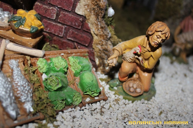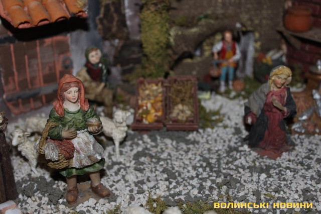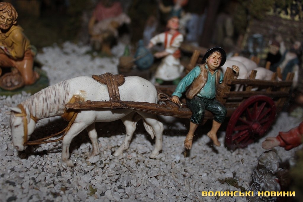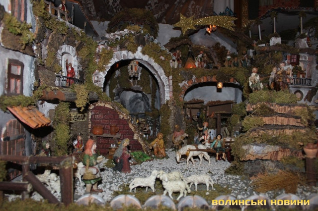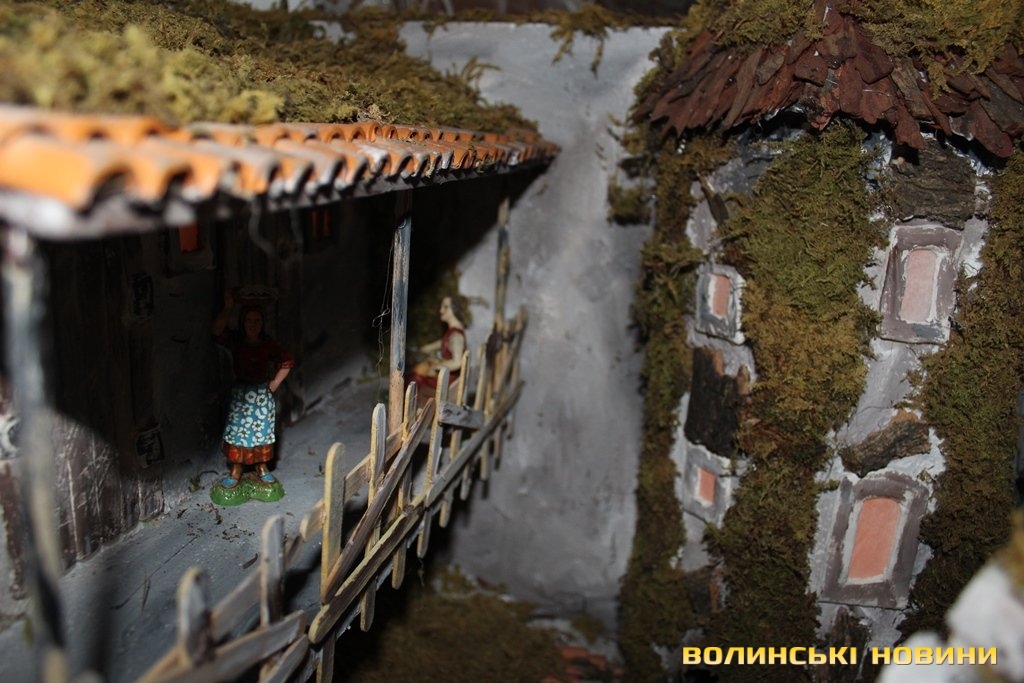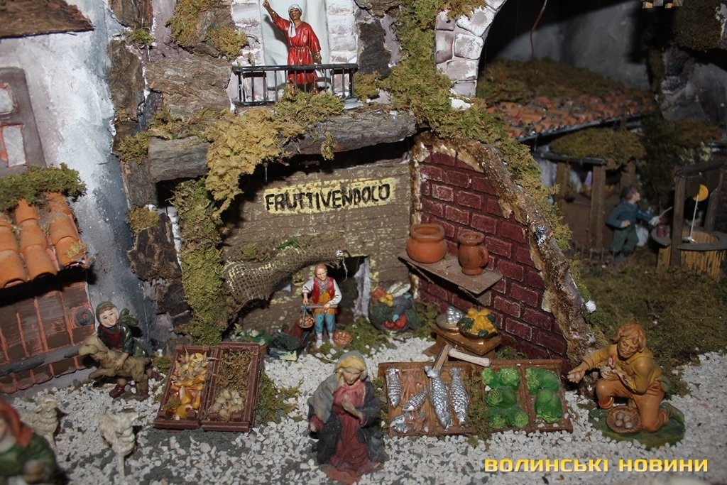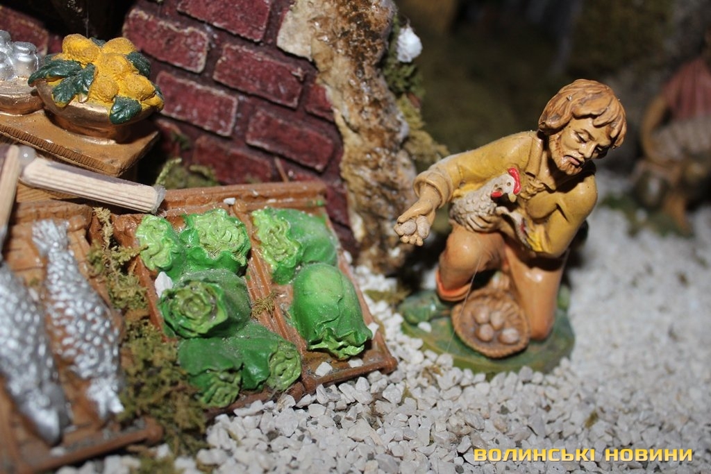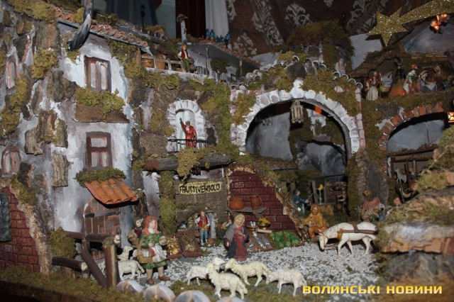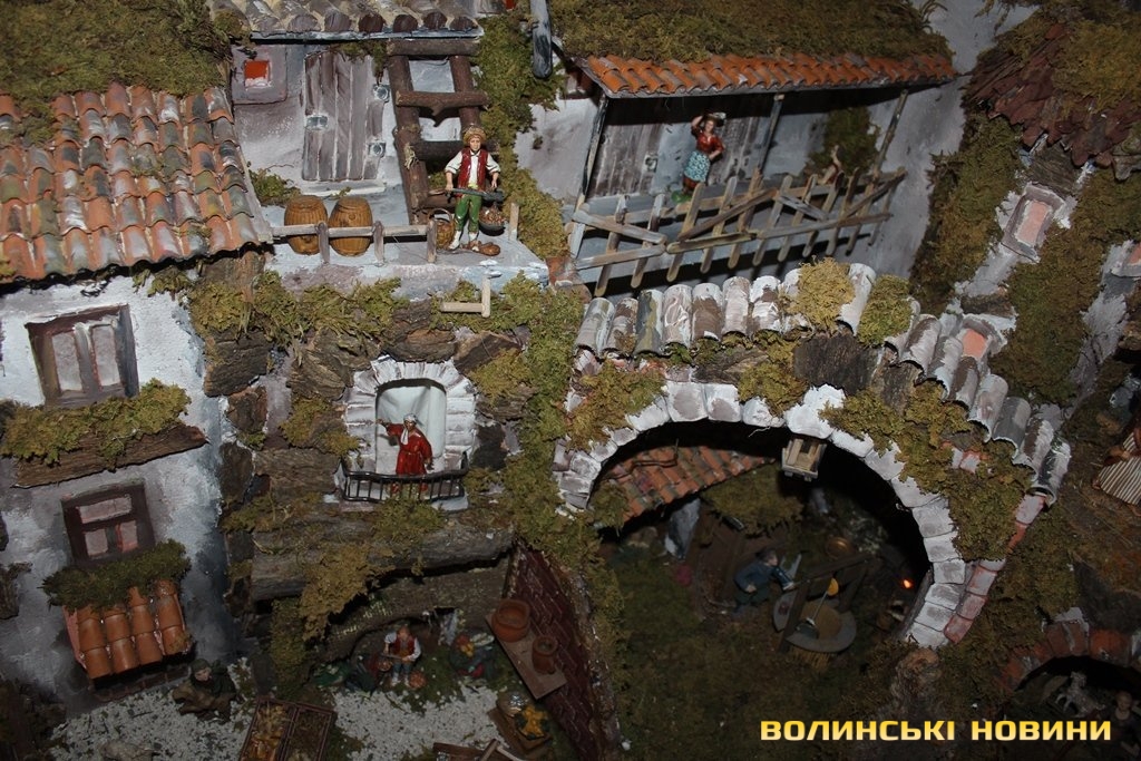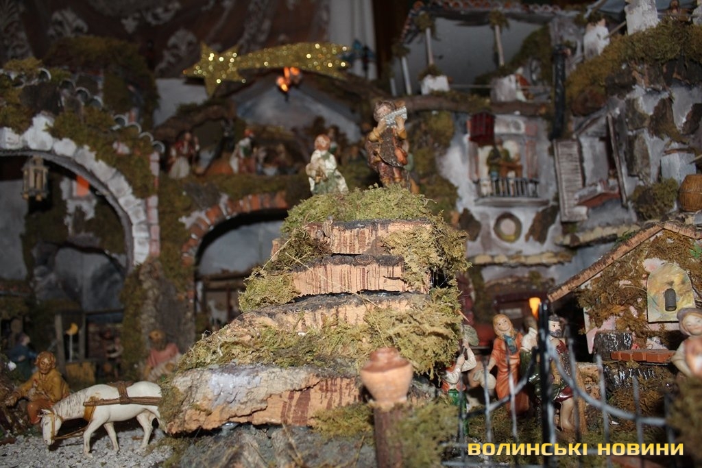 Незвичний вертеп з’явився в однову з храмів Луцька. Його унікальність привертає увагу сотні глядачів, адже таке відчуття, що у ньому вирує життя. Особливо полюбляють збиратися біля вертепу дітлахи. Такий подарунок храму Холмської Богородиці зробила лучанка, яка виїхала в Італію.Вертеп складається з півсотні мініатюрних фігурок: від вельмож до простих селян. Кожна з них не лише статуетка людини, а й певна життєва історія, в якій кожен у русі, будучи зайнятим буденними справами. Одні відпочивають, хтось працює, інші поросят на ринок везуть.А в цей час яскраво світить зірка над новонародженим Ісусом, біля якого стоять ангели і прийшли волхви з дарунками. Навколо триповерхові будиночки у яких багато деталей у мініатюрі. Наприклад, де майстер робить бочки, видно інструмент, з яким він працює.Заглянувши у бокове віконце на другому поверсі, видно, що сім’я зібралась за столом вечеряти і дружина якраз взяла на вилку шматок м’яса й відкрила вуста.Усе це створює відчуття живого дійства. Окрім цього, багато елементів вертепу рухомі і світяться: крутиться вітряк на млині, в колодязі відерце опускається і піднімається, італієць прасує одяг, а пекар закладає у піч паляниці.Ці масштабні мініатюри вражають, адже стільки подій гармонійно розміщені у вертепі, довжина якого 150 сантиметрів, ширина 95 сантиметрів і висота 63 сантиметри.«Фігурки по зовнішності - італійці, вони не відображають тогочасний єврейський побут, але показують плинність життя і головну подію для християн – народження Спасителя. Під час служби, дітей тут збирається багато, навіть, деякі фігурки вже не рухаються, бо малечі цікаво усе потрогати. Але нічого страшного, ми потім усе перемонтуємо», - каже отець Артем Кованський.Пригадує отець Артем Кованський, що торік у храм Холмської Богородиці завітали гості з Італії і пообіцяли зробити цікавий подарунок до різдвяних свят: «Торік, приїхавши в Україну, вони зайшли в храм Холмської Богородиці, який знаходиться в Луцьку по проспекту Волі, навпроти четвертої гімназії. Гості побачили невеличкий вертеп у святому місці і вирішили на наступний рік виготовити щось унікальне».