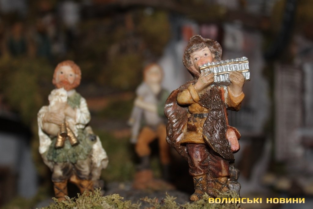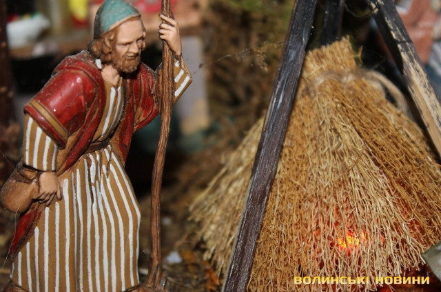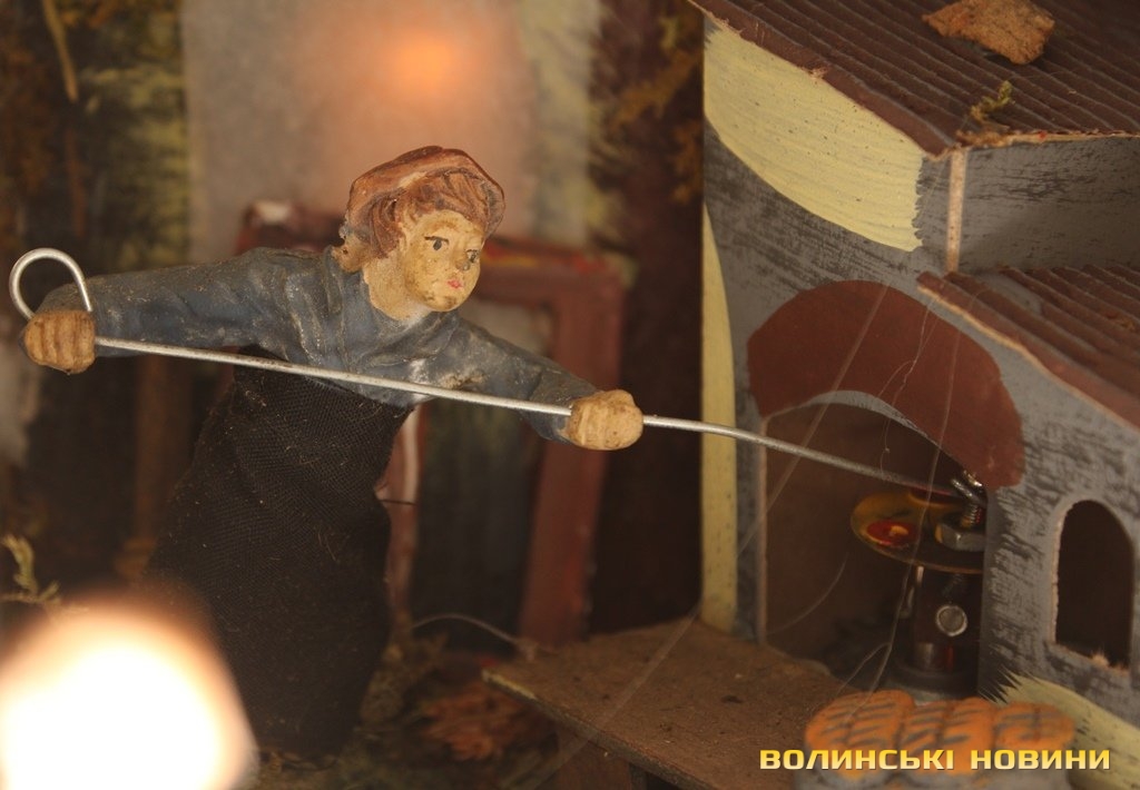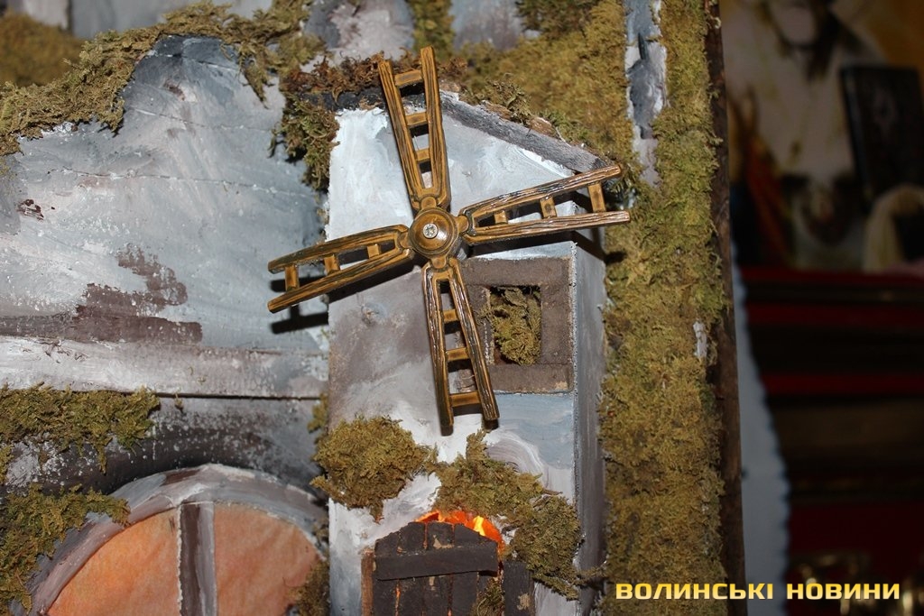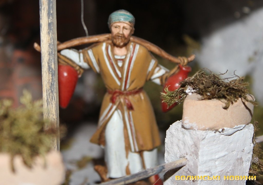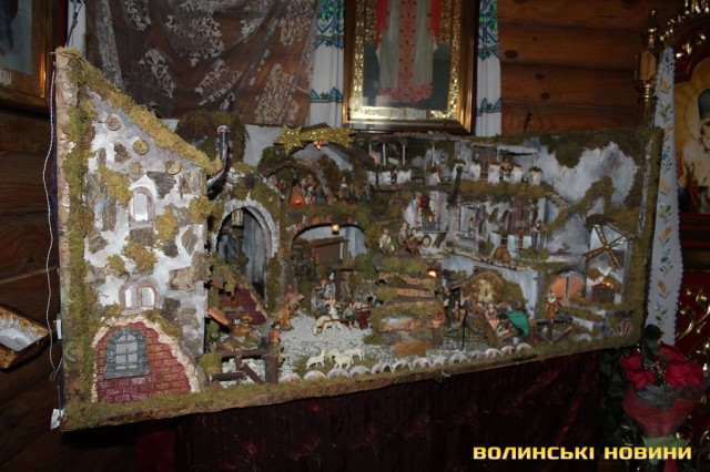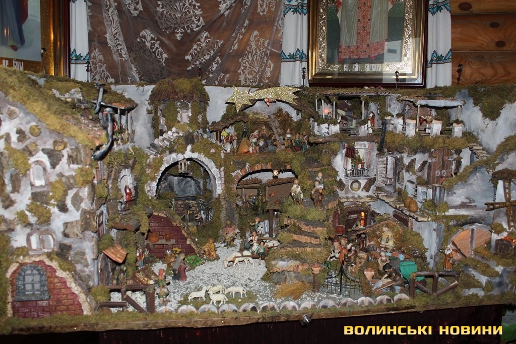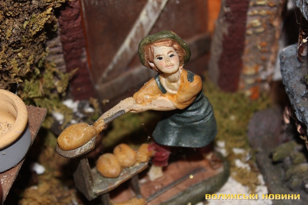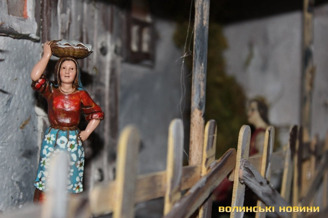 Незвичний вертеп з’явився в однову з храмів Луцька. Його унікальність привертає увагу сотні глядачів, адже таке відчуття, що у ньому вирує життя. Особливо полюбляють збиратися біля вертепу дітлахи. Такий подарунок храму Холмської Богородиці зробила лучанка, яка виїхала в Італію.Вертеп складається з півсотні мініатюрних фігурок: від вельмож до простих селян. Кожна з них не лише статуетка людини, а й певна життєва історія, в якій кожен у русі, будучи зайнятим буденними справами. Одні відпочивають, хтось працює, інші поросят на ринок везуть.А в цей час яскраво світить зірка над новонародженим Ісусом, біля якого стоять ангели і прийшли волхви з дарунками. Навколо триповерхові будиночки у яких багато деталей у мініатюрі. Наприклад, де майстер робить бочки, видно інструмент, з яким він працює.Заглянувши у бокове віконце на другому поверсі, видно, що сім’я зібралась за столом вечеряти і дружина якраз взяла на вилку шматок м’яса й відкрила вуста.Усе це створює відчуття живого дійства. Окрім цього, багато елементів вертепу рухомі і світяться: крутиться вітряк на млині, в колодязі відерце опускається і піднімається, італієць прасує одяг, а пекар закладає у піч паляниці.Ці масштабні мініатюри вражають, адже стільки подій гармонійно розміщені у вертепі, довжина якого 150 сантиметрів, ширина 95 сантиметрів і висота 63 сантиметри.«Фігурки по зовнішності - італійці, вони не відображають тогочасний єврейський побут, але показують плинність життя і головну подію для християн – народження Спасителя. Під час служби, дітей тут збирається багато, навіть, деякі фігурки вже не рухаються, бо малечі цікаво усе потрогати. Але нічого страшного, ми потім усе перемонтуємо», - каже отець Артем Кованський.Пригадує отець Артем Кованський, що торік у храм Холмської Богородиці завітали гості з Італії і пообіцяли зробити цікавий подарунок до різдвяних свят: «Торік, приїхавши в Україну, вони зайшли в храм Холмської Богородиці, який знаходиться в Луцьку по проспекту Волі, навпроти четвертої гімназії. Гості побачили невеличкий вертеп у святому місці і вирішили на наступний рік виготовити щось унікальне».