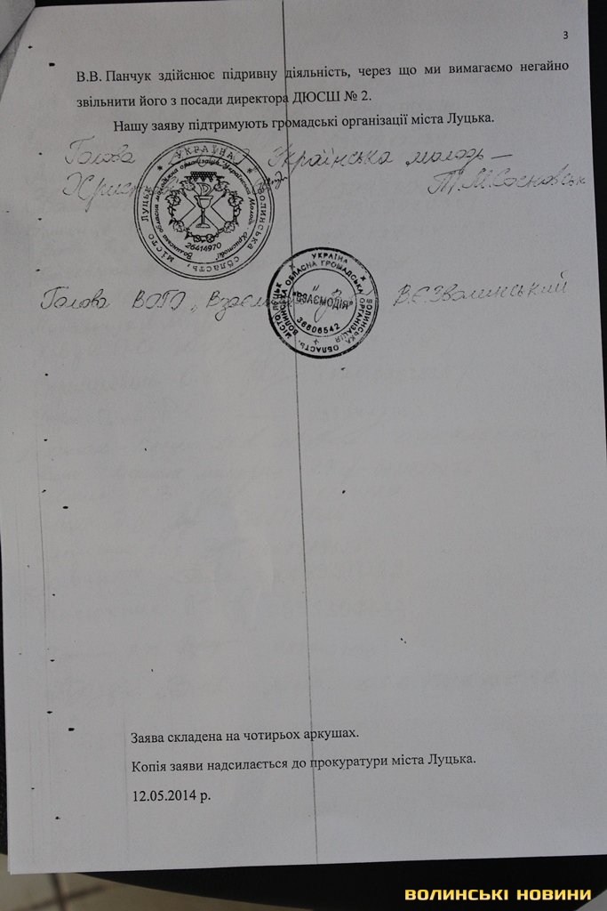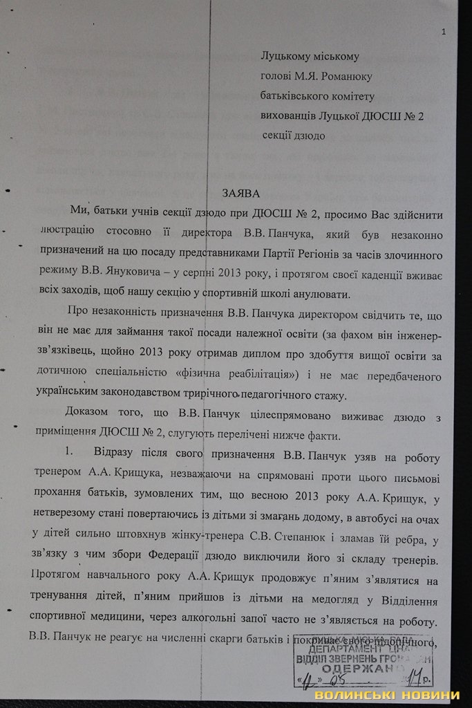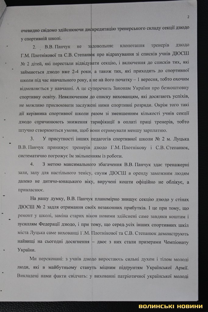 «Ми - батьки учнів секції дзюдо ДЮСШ №2, просимо Вас здійснити люстрацію стосовно її директора Валерія Панчука, якого незаконно призначили на цю посаду представники Партії Регіонів за часів злочинного режиму Віктора Януковича – у серпні 2013-го року. Він робив все, аби секцію дзюдо анулювати у нашій школі. На роботу взяв тренера, який з’являється п'яним на роботу, а через пияцтво часто не приходить на тренування. Окрім того, директор спортшколи не включає до списку учнів тих дітей, які вже роками займаються в секції дзюдо. Також дітям відмовляє у навчанні. Були випадки, коли Панчук принижував тренерів секції дзюдо та погрожував їх звільнити. З метою власного збагачення директор ДЮСШ №2 здає в оренду тренажерні зали, сауни заможним людям, а виручені кошти не обліковує й привласнює», - обурюються у заяві лучани.