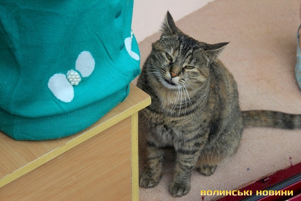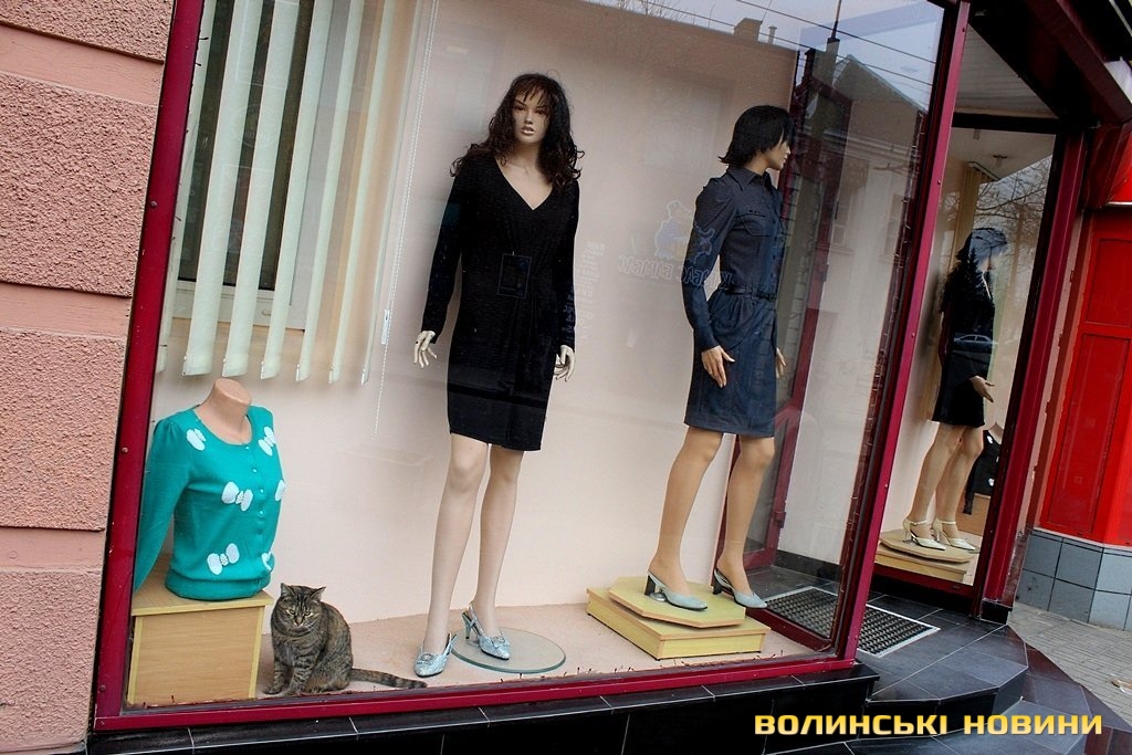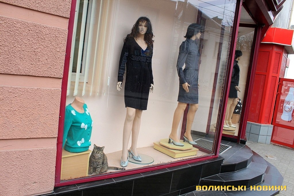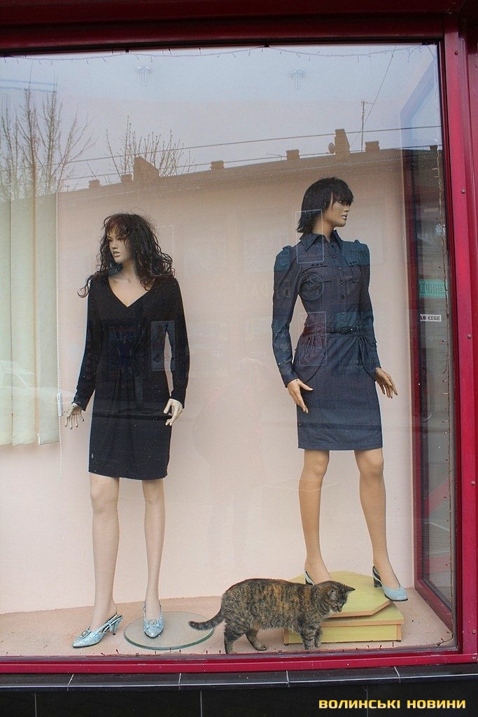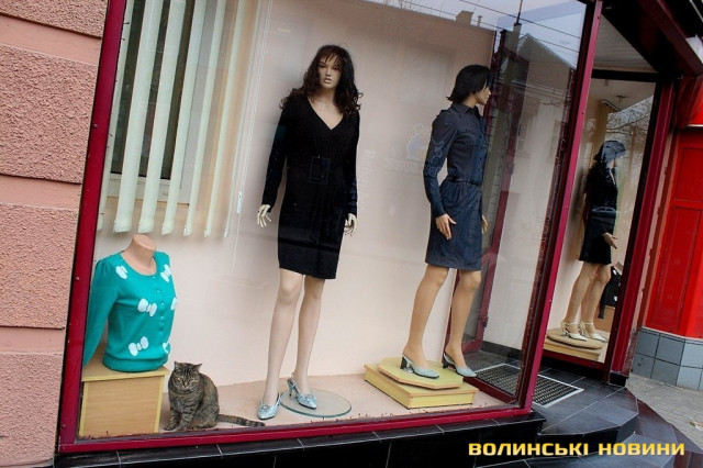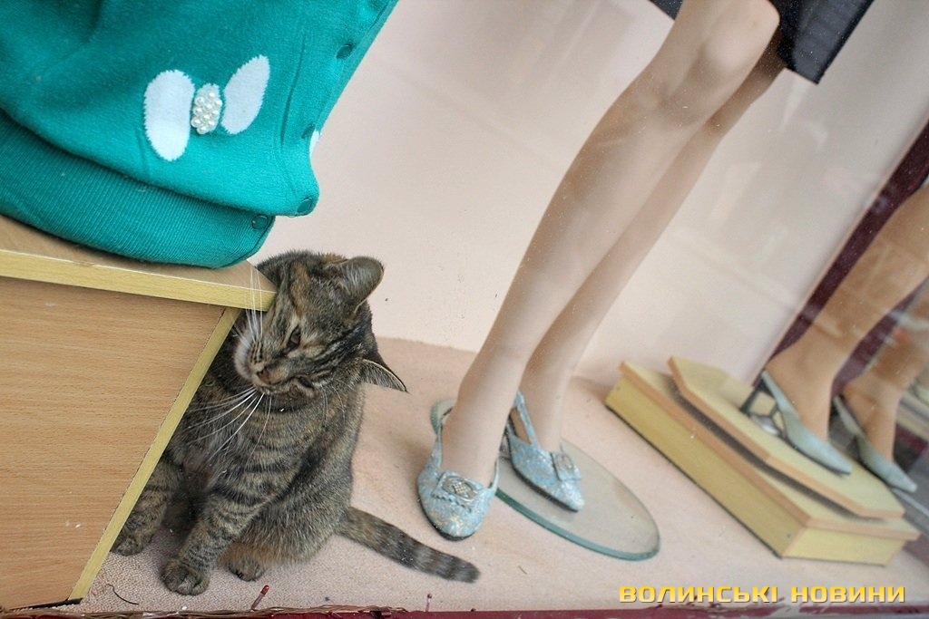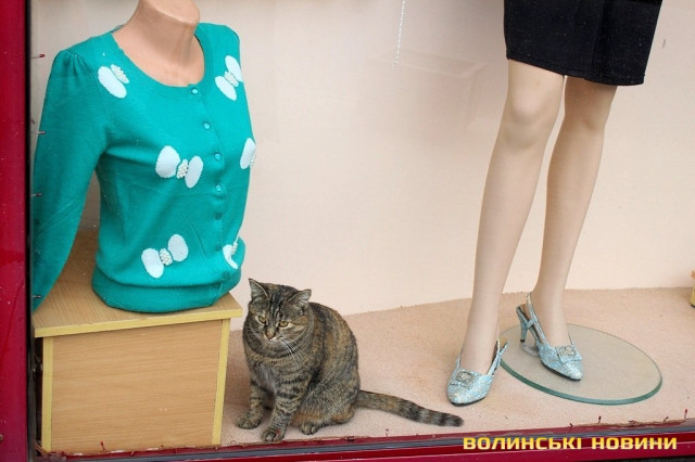 Біля прилавку одного із салонів-магазинів, що у центрі міста – незвичайний «працівник». Так, поруч із манекенами спокійно походжає туди-сюди смугаста кішка.Звичайні перехожі зупиняються біля магазину, аби сфотографуватися із тваринкою. Створюється враження, що киця просто не може самостійно вибратися із вітрини. Однак, працівники торгової установи стверджують, що їхня улюблениця там мешкає уже з жовтня минулого року.«Наша киця раніше жила із бабусею, утім, коли старенька померла, тваринка почала приходити до нас. Ми її дуже любимо, ось бачите, для неї облаштували й почесне місце за прилавком», - розповідає одна із працівниць магазину й демонструє м’яку подушечку. Зі слів жінки, тваринка їсть абсолютно усе, навіть чорний хліб.