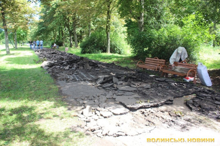 Гори старого асфальту вже познімали з алей у Центральному парку імені Лесі Українки в Луцьку. Підготовчі роботи до вкладання бруківки тривають.