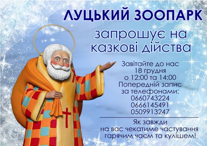 Луцьких дітлахів кличуть у Луцький зоопарк на зустріч зі Святим Миколаєм, яка відбудеться у неділю, 18 грудня.