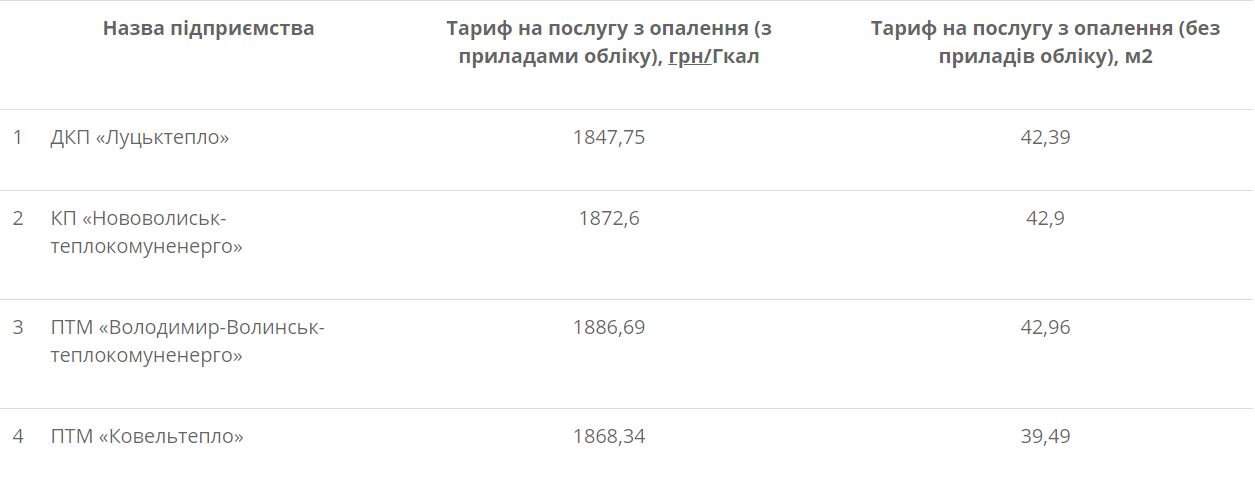 З таблиці видно, що різниця незначна, і становить менше 20 грн/Гкал між найнижчим показником (ДКП «Луцьктепло») та найвищим (ПТМ «Володимир-Волинськ-теплокомуненерго»).