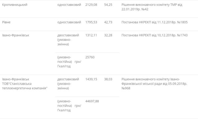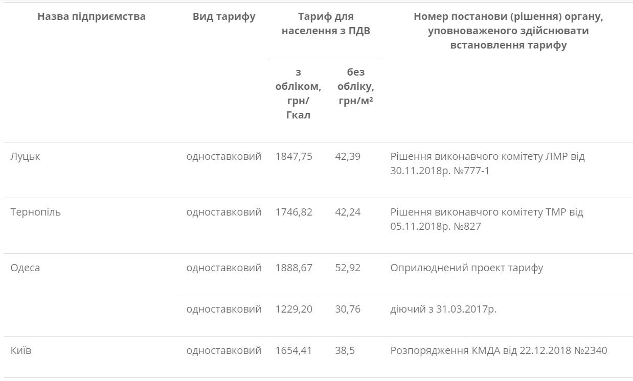 В таблиці нижче наведено вибірку теплопостачальних підприємств України, де вказано вид тарифу, його розмір та реквізити рішення про введення тарифу в дію.