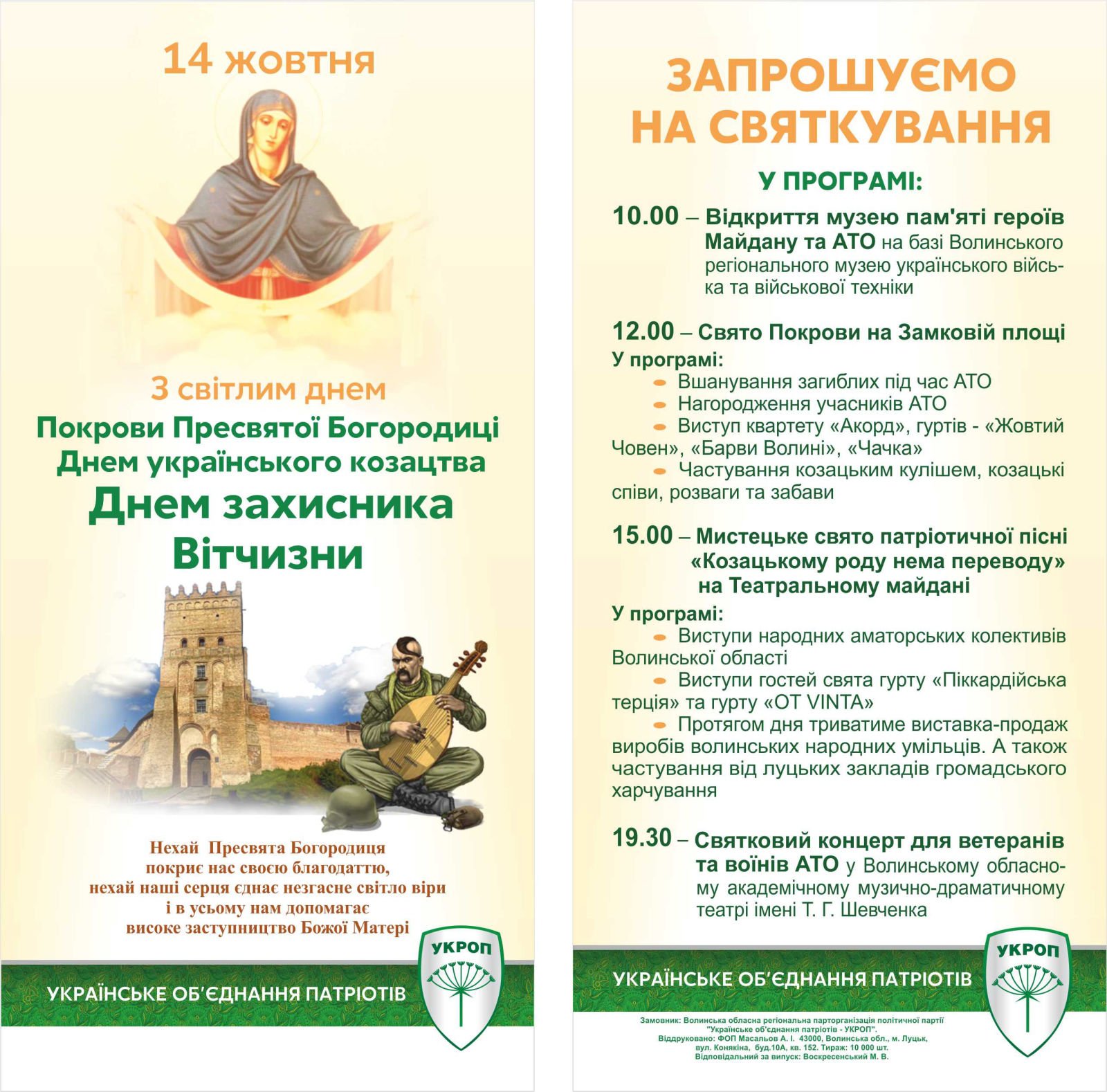 Цього дня у Луцьку відбудеться низка заходів. Зокрема, відкриття музею пам’яті героїв Майдану та АТО, свято Покрови на Замковій площі, під час якого відбудеться нагородження учасників АТО, мистецьке свято патріотичної пісні та святковий концерт для ветеранів та воїнів АТО. Ці заходи відбуватимуться за сприяння Фонду Ігоря Палиці «Новий Луцьк» та Волинського осередку партії УКРОП.