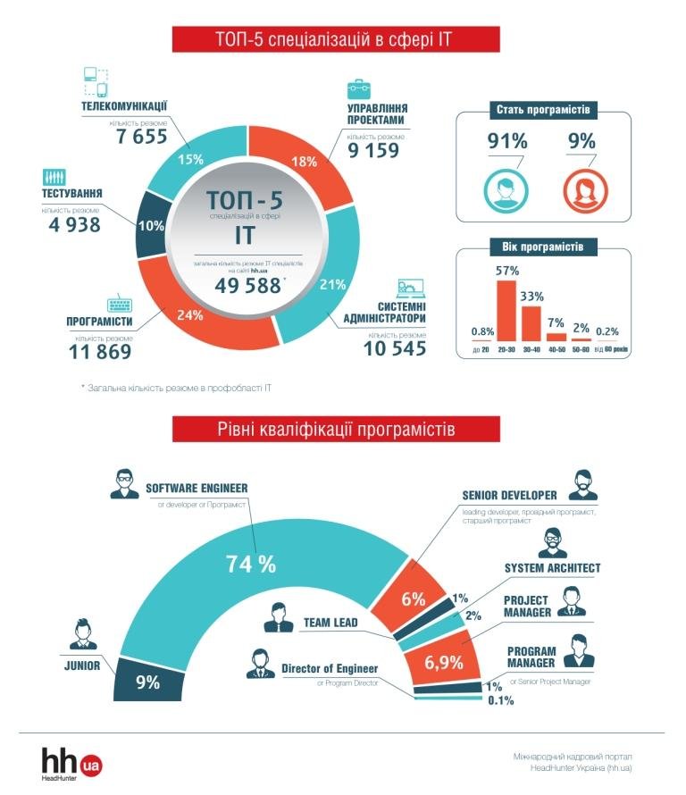 До слова, IT-галузь вабить пошукачів високими заробітками і стабільною позицією компаній навіть у кризові часи. Втім HR-спеціалісти, які працюють в IT-сфері, відчувають брак кваліфікованих кадрів. Міжнародний кадровий портал HeadHunter Україна за результатами аналізу бази резюме у 2015 році склав портрет українського IT -спеціаліста.