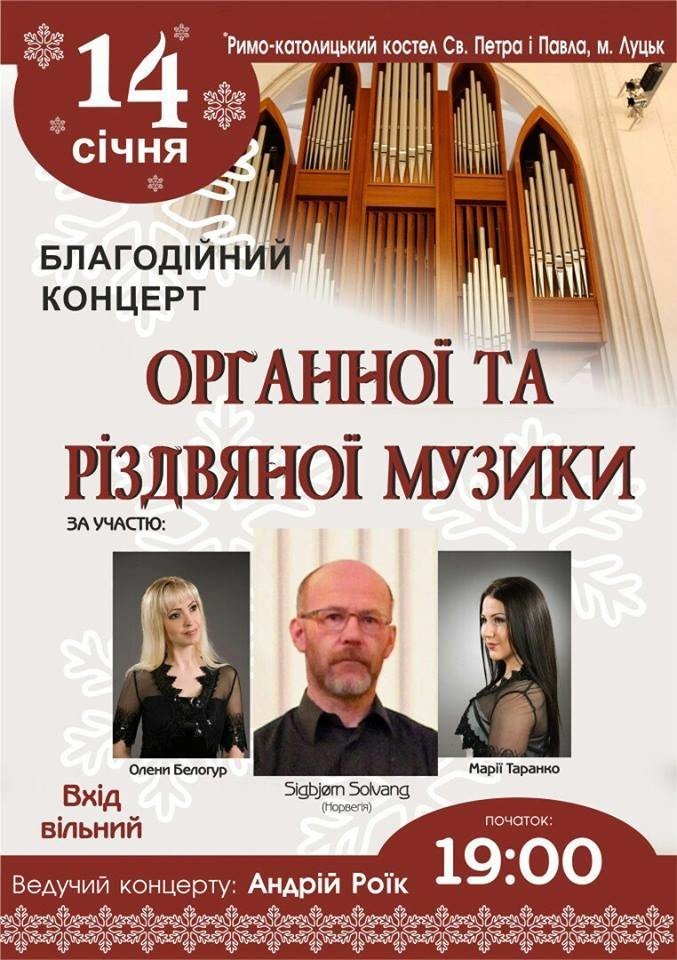 У Луцьку відбудеться благодійний концерт органної та різдвяної музики.
