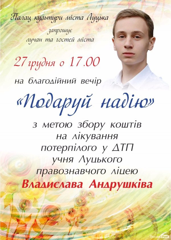 Метою заходу буде збір коштів на лікування потерпілому в ДТП учневі правознавчого ліцею Владиславу Андрушківу, пише Волинь.Post.