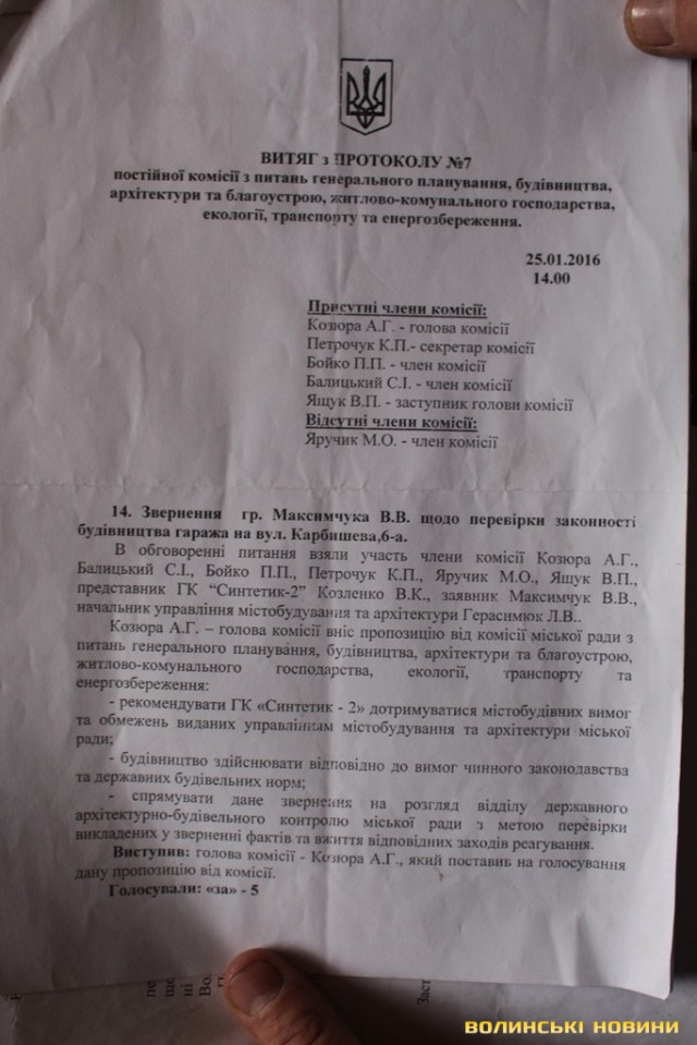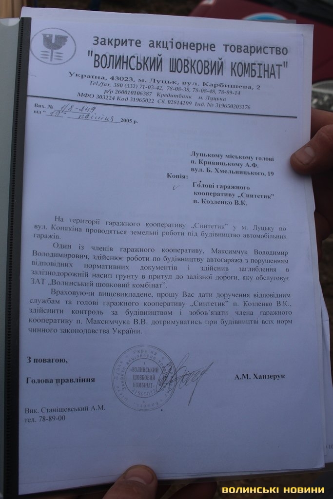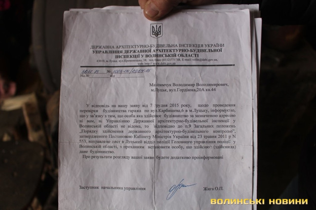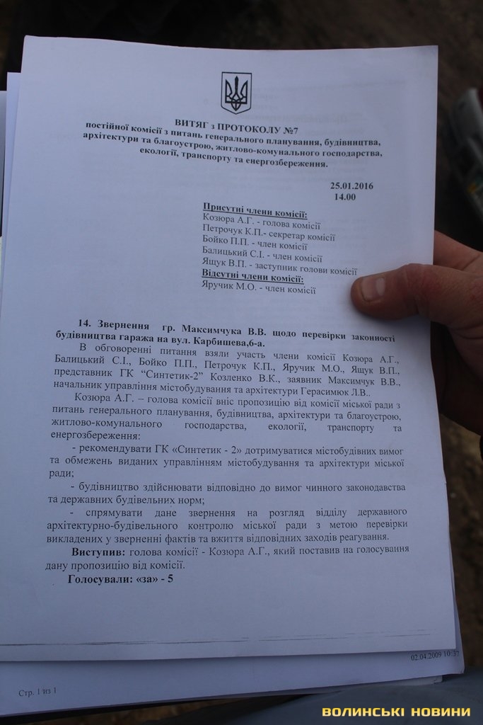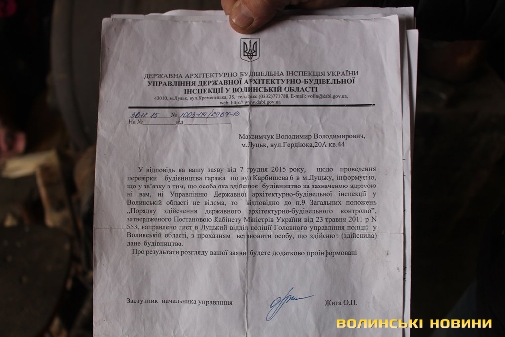 Із документів видно, що звернувшись у постійну комісію Луцькради, яка займається питаннями будівництва, Володимир Максимчук отримав від голови комісії Андрія Козюри відписку. У відповіді сказано рекомендувати ГК «Синтетик - 2» дотримуватися містобудівних вимог та обмежень виданих управлінням містобудування та архітектури міської ради. А пану Володимиру рекомендували звернутися у відділу державного архітектурно-будівельного контролю.Дослухавшись порад депутатів, пан Володимир звернувся в архбудконтроль. Отримав ще одну відписку: