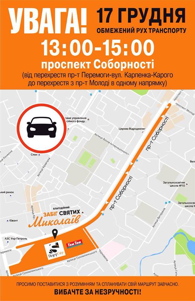 «Просимо вибачення за порушення зони Вашого комфорту, візьміть до уваги, що у неділю, 17 грудня, з 13:00 до 15:00 буде перекрита частина проспекту Соборності (в напрямку ТРЦ Порт Сіті) до перехрестя з проспектом Молоді.