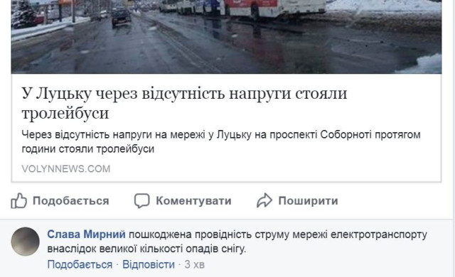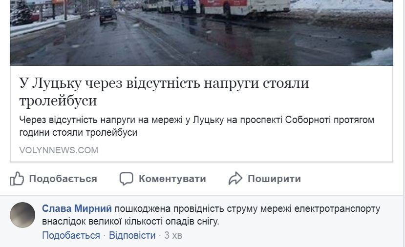 У коментарі до допису лучанин Слава Мирний зауважив, що мережі електротранспорту були пошкоджені вналідок великої кількості опадів снігу.