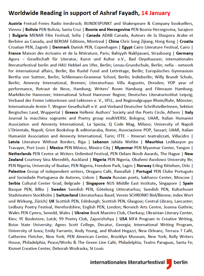 14 січня 2016 по всьому світу відбудуться Всесвітні читання на підтримку несправедливо засудженного (Worldwide Reading in support of Ashraf Fayadh), до ініціативи доєдналося понад 60 країн та майже 300 авторів. Серед них – лауреати Нобелівської премії з літератури: Герта Мюллер, Орхан Памук, Маріо Варгас Льоса, Ельфріда Єлінек та інші. Аналогічні акції пройдуть в Україні, зокрема і в Луцьку. Учасниками читань будуть волинські поети та актори аматорського театру-студії «Гармидер».