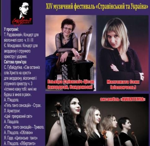 У рамках XIV музичного фестивалю «Стравінський та Україна» відбудеться концерт відомих виконавців із Республіки Польща – Ельвіри Слівкевич-Цісак (акордеон, бандонеон), Малгожати Сенк (віолончель), ансамблю «KWARTEMIA».