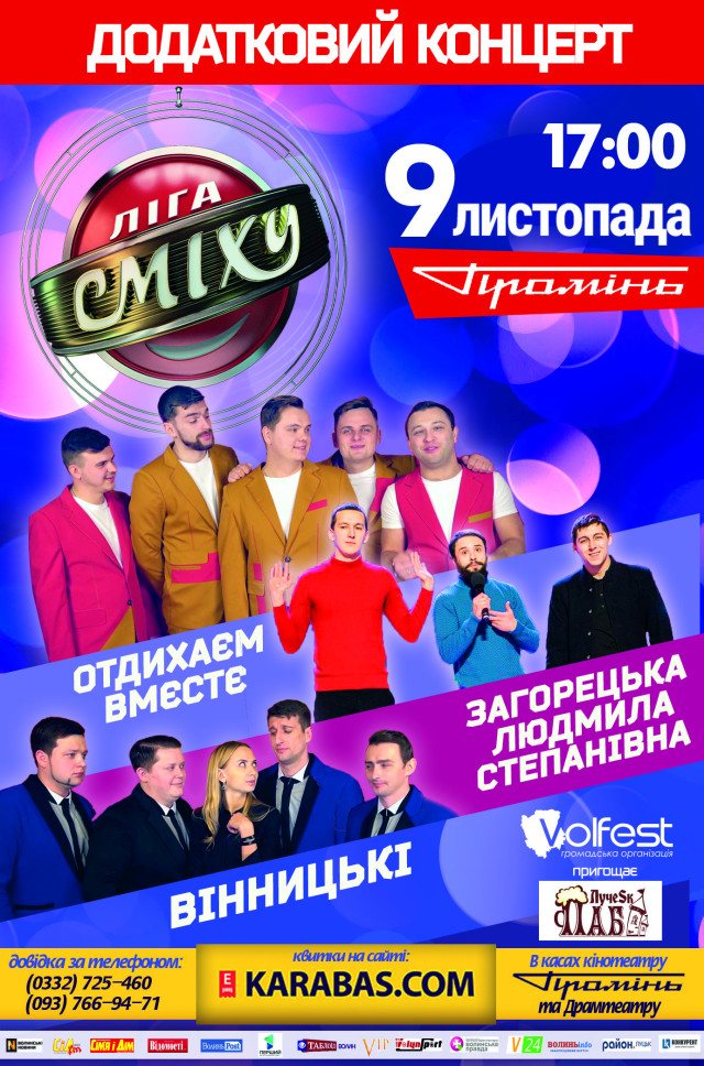 Квитки на концерт можна придбати на сайті https://lutsk.karabas.com/ua/velikij-gumoristichnij-koncert-komand-ligi-smihu-6/order/ та в касі РЦ Промінь