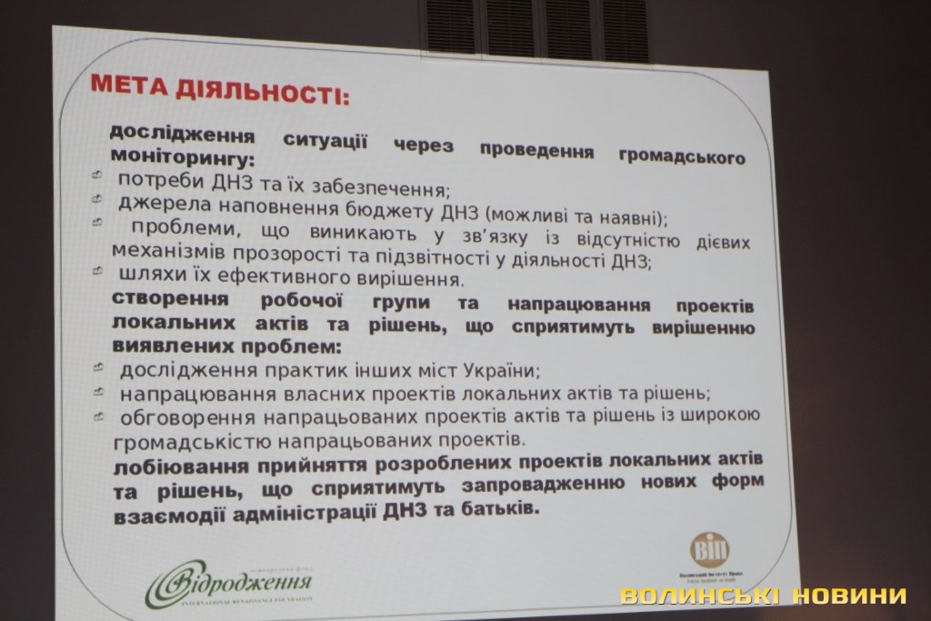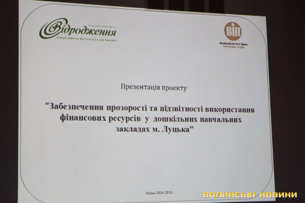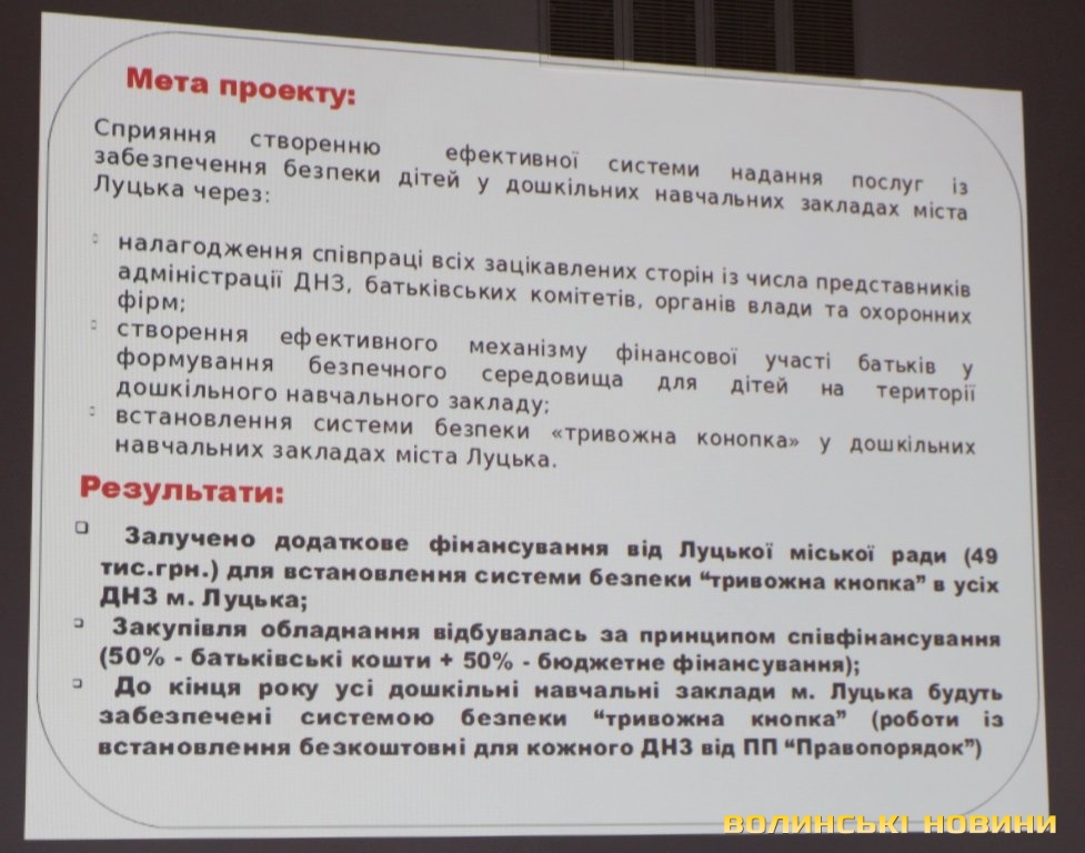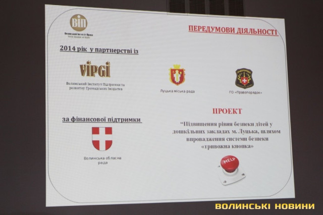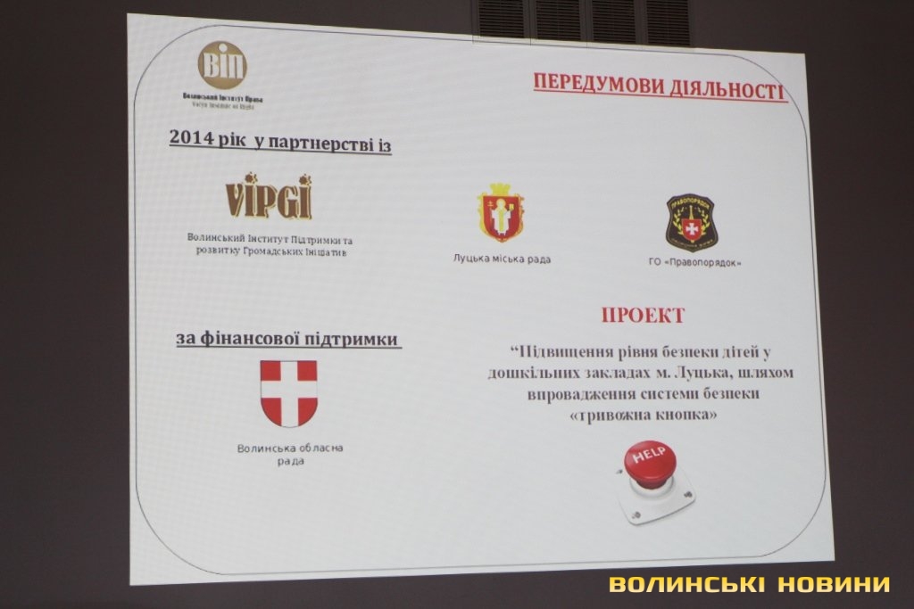 Як повідомила представник Волинського інституту права Ірина Гайдучик, проект «Забезпечення прозорості та підзвітності використання фінансових ресурсів у дошкільних навчальних закладах Луцька» раніше у партнерстві з Волинським інститутом підтримки та розвитку громадських ініціатив, Луцькою міськрадою та ГО «Правопорядок», мав на меті встановити систему безпеки "тривожна кнопка" у кожному ДНЗ міста. Тоді вдалося побачити проблеми та основні моменти, які потрібно враховувати в подальшій діяльності для того, щоб знімати напругу, яка виникає в ДНЗ. Акцент робили на співпрацю батьків, адміністрації ДНЗ та влади, - аби вони скооперувалися та вирішили проблему безпеки перебування дітей у дошкільних навчальних закладах. На основі проекту вдалося залучити фінансування облради та міської ради, встановивши системи безпеки у кожному ДНЗ. Фінансування відбувалося за принципом «50 на 50» - половина батьківських коштів та половина бюджетних.