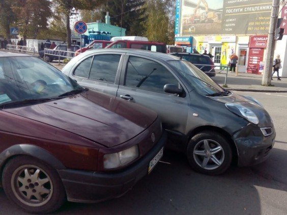 Я був очевидцем цієї "пригоди" - якраз переходив перехід навпроти ринку, а зіткнення відбулось між двома переходами. Банальна ситуація з незнання елементарних правил руху зі сторони авто вишневого кольору. Обидва водії - молоді жінки. Та, за якою право, вискочила з машини і зразу застосувала ненормативну лексику: "Куди ти, бл*дь-с*ка, їдеш!?.. Обійшлось без бійки, ніхто нікого за волосся не тягав, нікого мордою об асфальт не били. Богу дякувати... Бо ж знаєте, усе могло бути коли дві б*би... Далі не буду, а то теж тягне на ненормативну лексику . На баранах їм би їздити по сільському подвір*ю.