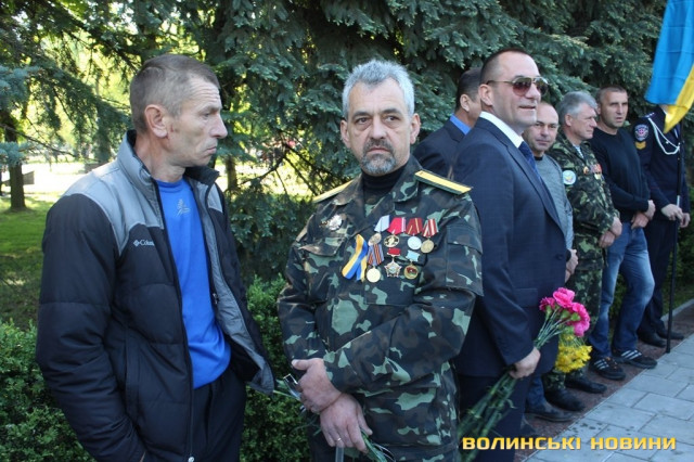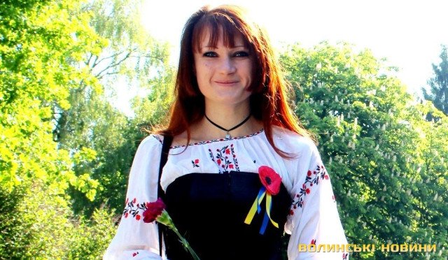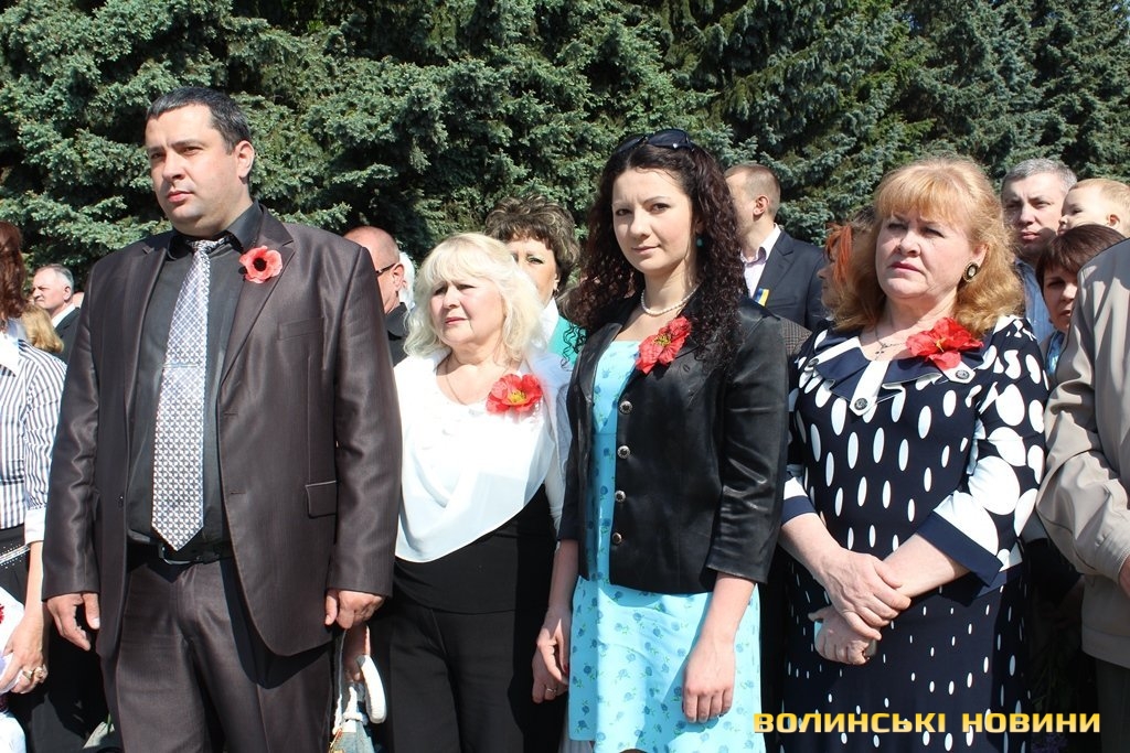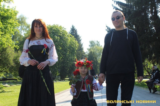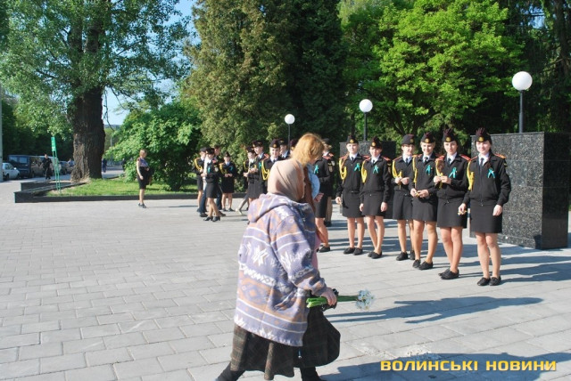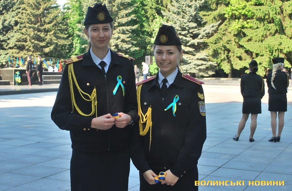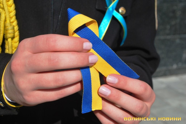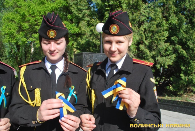 Із вулиці Шопена до меморіалу перехожиз зустрічали луцькі ліцеїсти. Дівчата усім охочим пропонували прикріпити до верхнього одягу синьо-жовту стрічку.«Ми роздаємо усім ці стрічки безплатно, бо ми українки», - каже ліцеїстка Ольга.