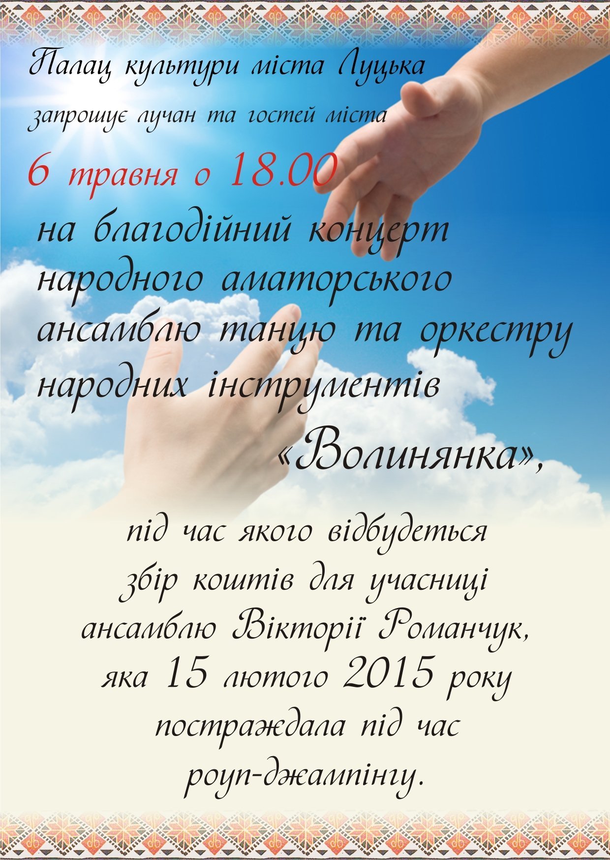 Лучан запрошують на благодійний концерт, на якому відбудеться збір коштів для Вікторії Романчук, яка постраждала внаслідок нещасного випадку. Благодійний концерт народного аматорського ансамблю танцю "Волинянка" та оркестру народних інструментів «Волинянка» відбудеться у Луцьку 6 травня.