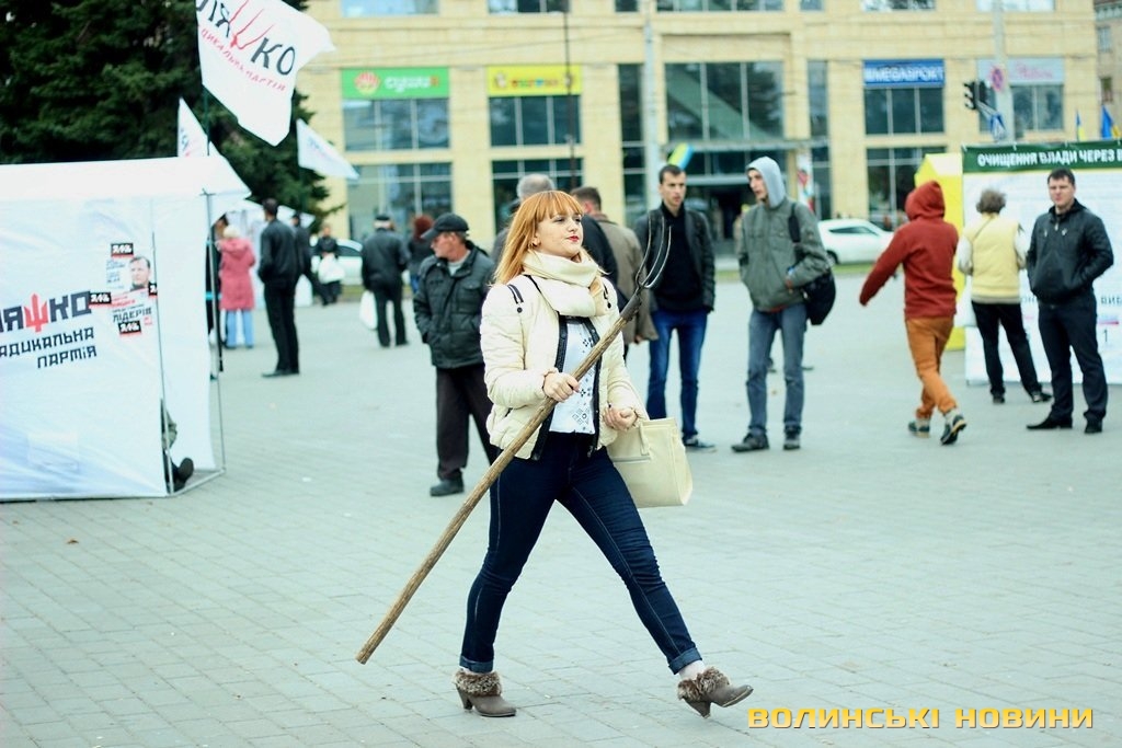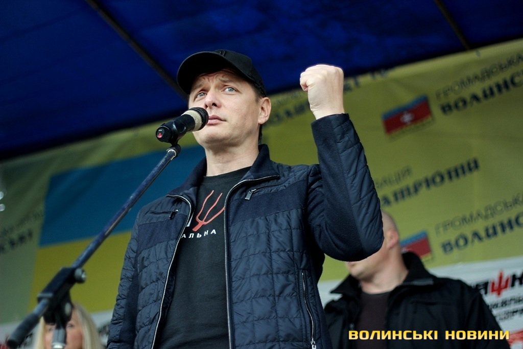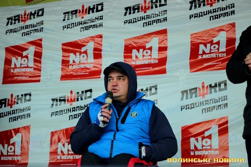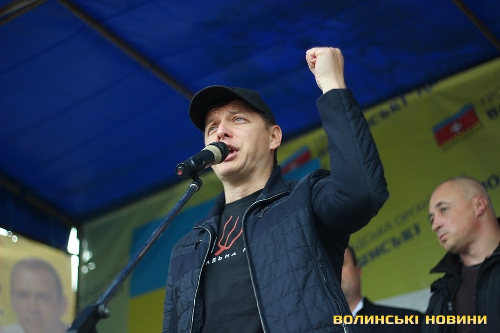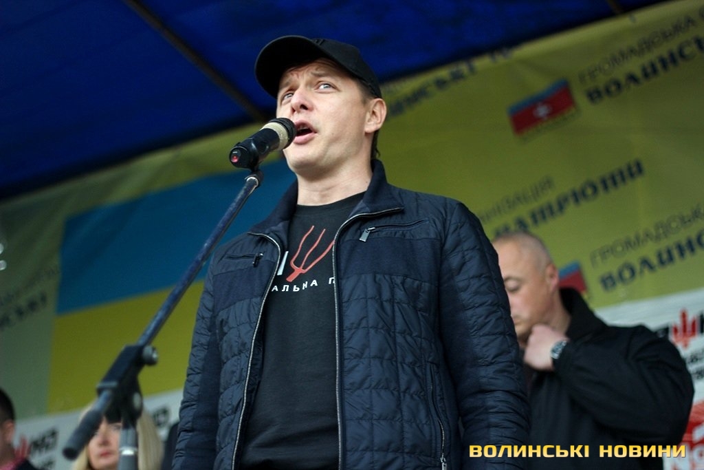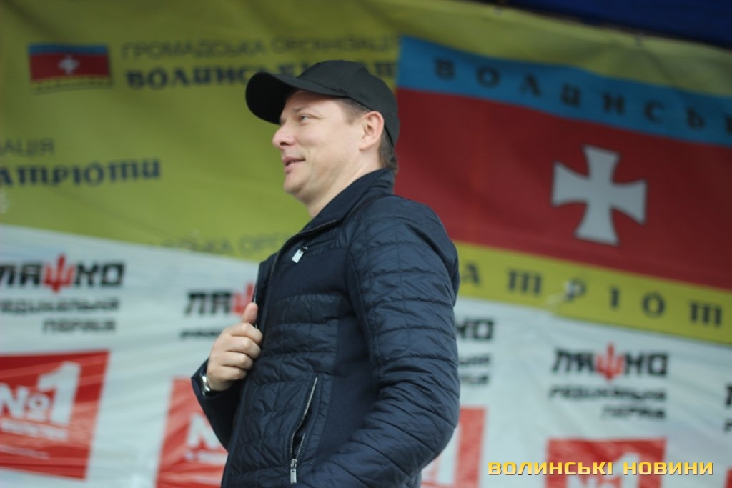 Окремі прихильники наполегливо чекали свого «героя» з вилами напоготові у прямому сенсі. До слова, захід відвідали орієнтовно понад чотири сотні краян. І ось майже о 17 годині лідер радикалів вийшов на сцену. Не довго думаючи, він зауважив, мовляв, на Волині – одні олігархи та «держиморди». І, звісно ж, їх потрібно негайно викорінювати та «не пускати до корита». Також він звернувся до присутніх із проханням «не продавати власні голоси за гривні та гречку». «307 депутатів, наче свині, знову рвуться до владного корита. Але, чому ж ви, св*лочі, туди претесь? Дзуськи вам, а не парламент!», - емоційно сказав він, зауваживши, що в радикальній партії немає жодної людини, яка колись була у Раді, окрім нього самого, а також лише одного пенсіонера, той – син легендарного командира УПА Романа Шухевича Юрій.