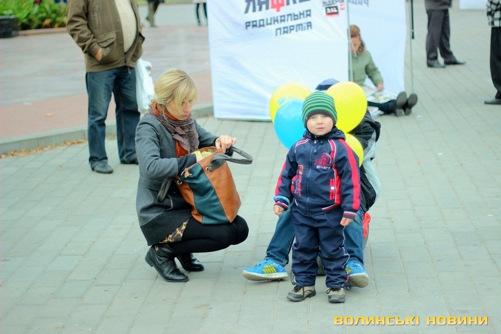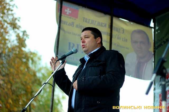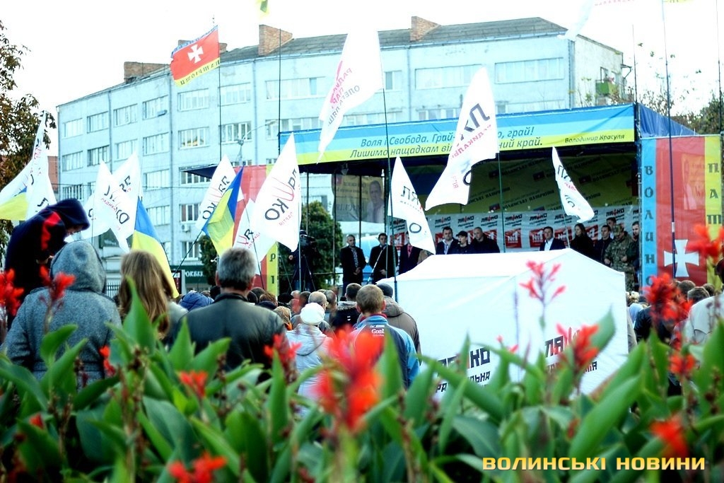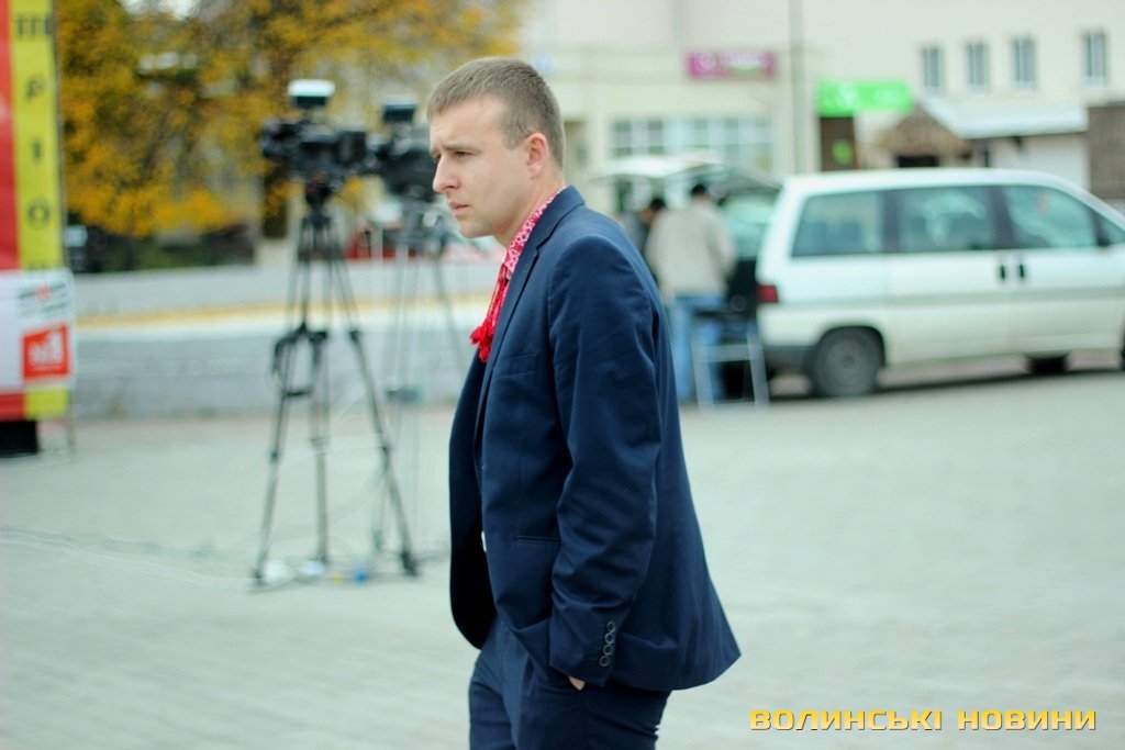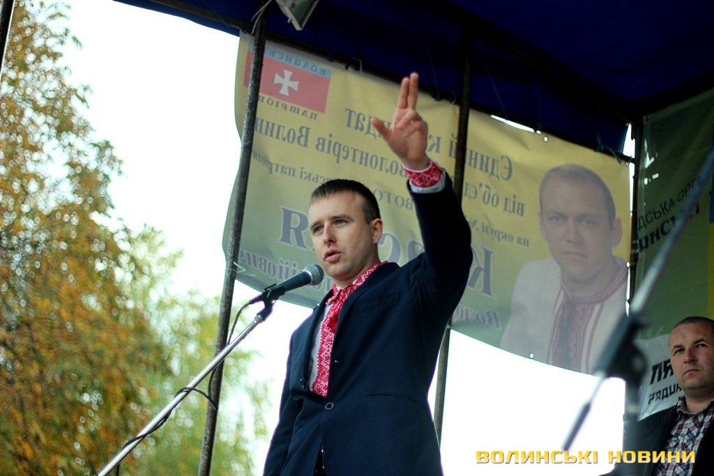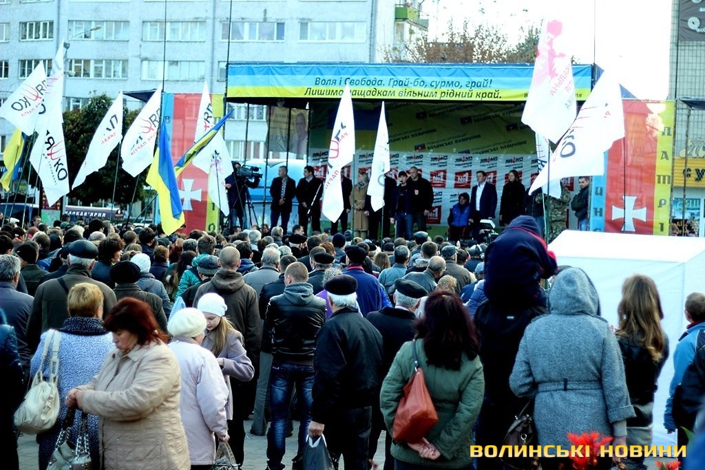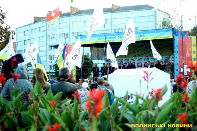 Окремі прихильники наполегливо чекали свого «героя» з вилами напоготові у прямому сенсі. До слова, захід відвідали орієнтовно понад чотири сотні краян. І ось майже о 17 годині лідер радикалів вийшов на сцену. Не довго думаючи, він зауважив, мовляв, на Волині – одні олігархи та «держиморди». І, звісно ж, їх потрібно негайно викорінювати та «не пускати до корита». Також він звернувся до присутніх із проханням «не продавати власні голоси за гривні та гречку». «307 депутатів, наче свині, знову рвуться до владного корита. Але, чому ж ви, св*лочі, туди претесь? Дзуськи вам, а не парламент!», - емоційно сказав він, зауваживши, що в радикальній партії немає жодної людини, яка колись була у Раді, окрім нього самого, а також лише одного пенсіонера, той – син легендарного командира УПА Романа Шухевича Юрій.